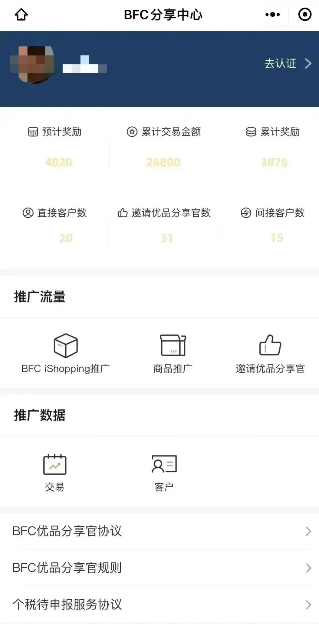 进入BFC分享中心,完成认证后,点击「分享官中心」或打开分享官推荐链接,同意分享官协议即可成为优品分享官。