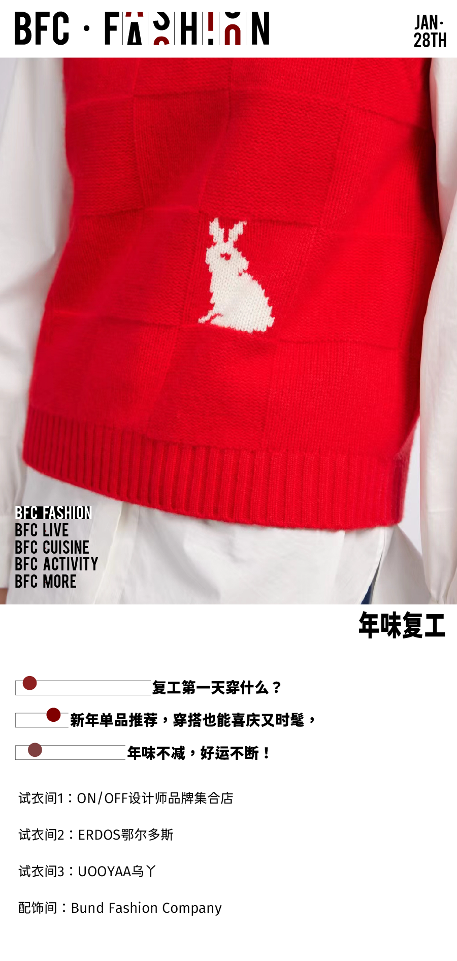 正红色最适合新年啦,小兔图案点睛,可爱不花哨。搭配鄂尔多斯白色围巾和毛线帽,新年氛围一整个拿捏住。这款圆领提花毛衣背心轻薄舒适,100%山羊绒保暖性极佳。