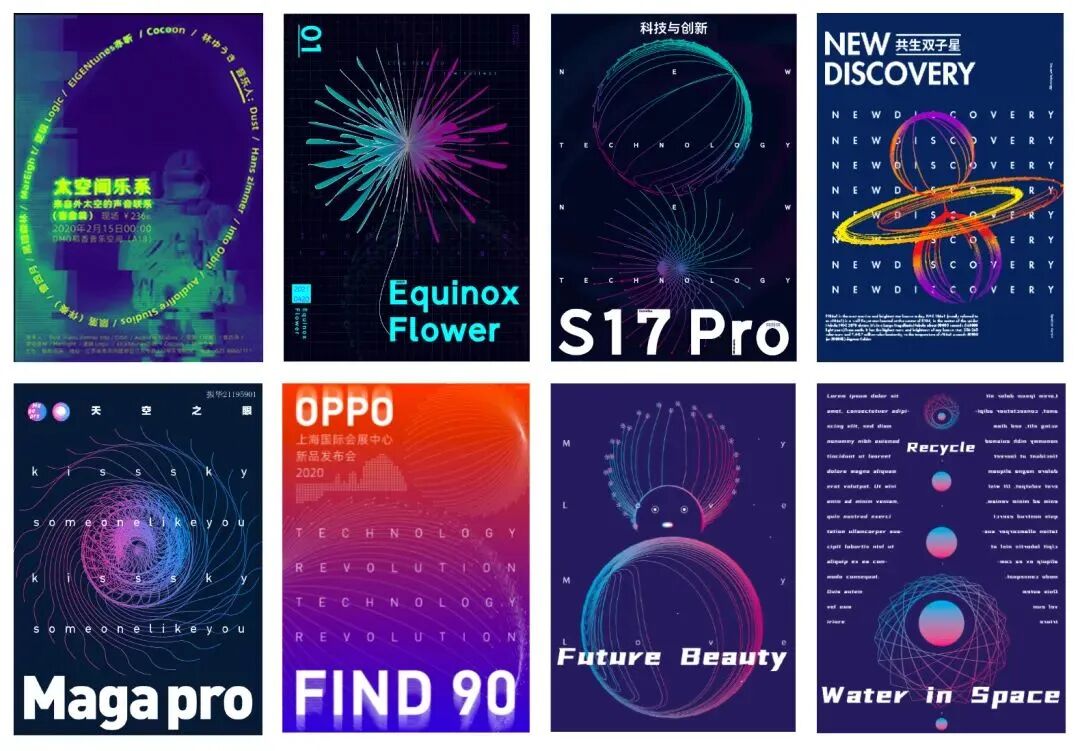 这类风格可以运用在人工智能、电子产品海报等的设计中,来增加酷炫的科技感!