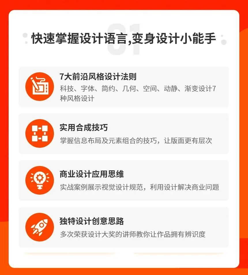 7天的时间,7节课程7个实战案例,老师带你学习科技风、纯文字风、简约风、几何风、空间感、动与静风格、流行渐变风7种创意风格设计,并在这些课程中,带大家了解版式编排、字体设计的一些技巧!