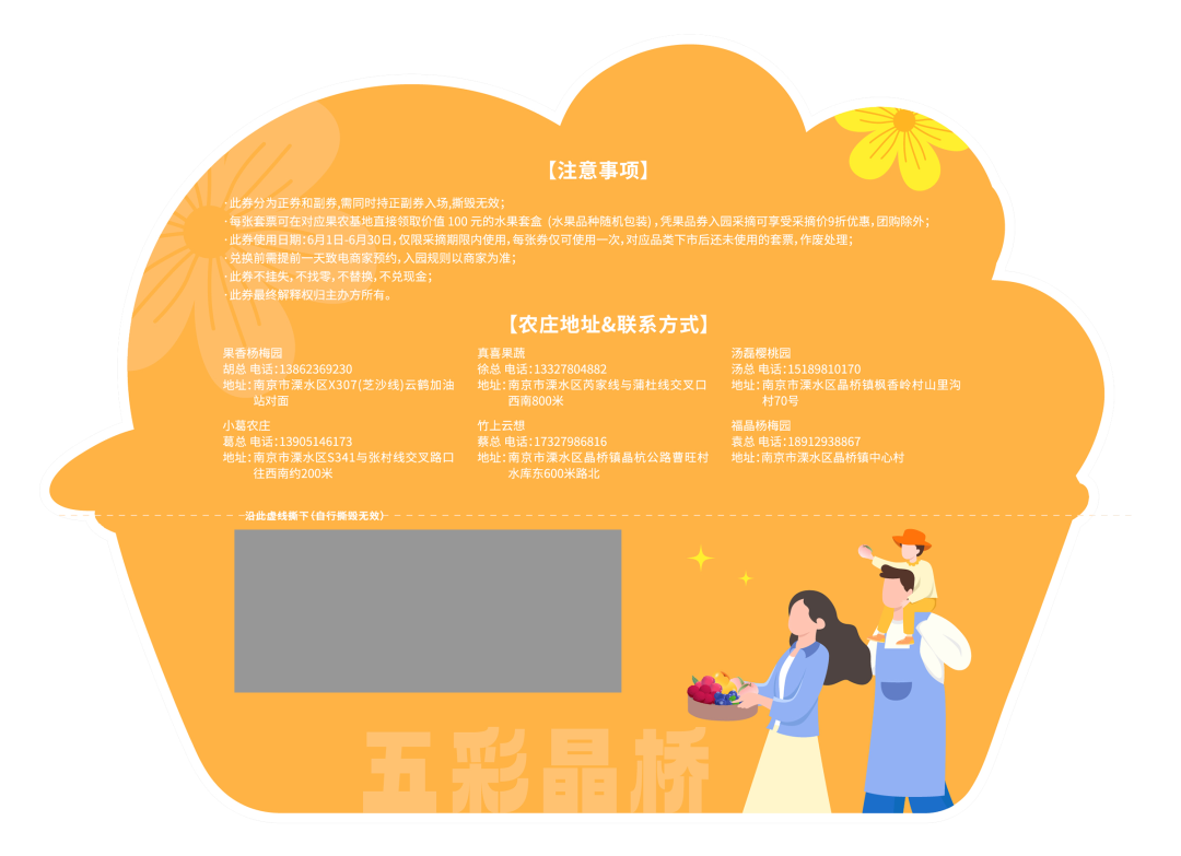 此套采摘套票根据水果品种,分为6款,游客获取采摘套票后,刮开涂层后,根据显示的水果品类,去往对应的农庄进行采摘。如,刮开为杨梅,则可在规定采摘期内体验杨梅采摘。