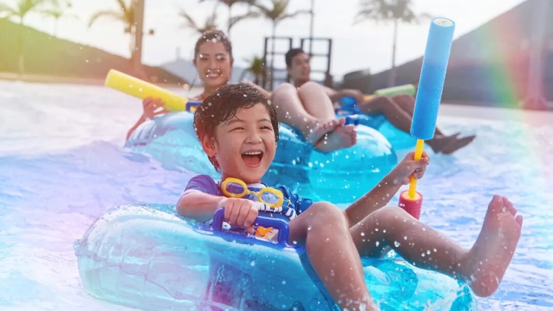 当然也有适合亲子玩乐的互动设施,来到“欢乐堡礁”区域,感受海风轻柔的吹拂;或走进“迷失部落”,在专业教练的指导下,体验冲浪的乐趣。