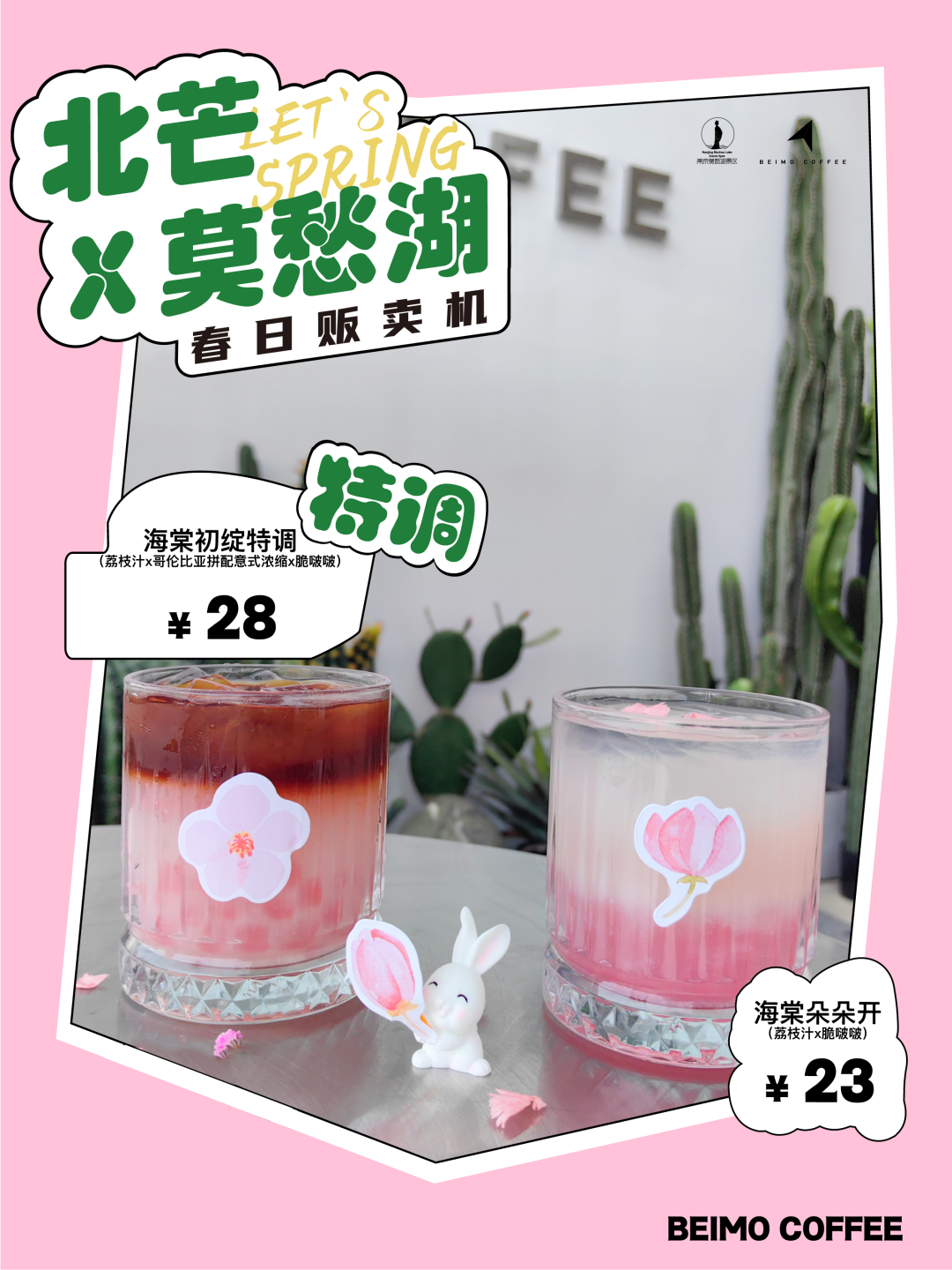在周末艺术家市集的活动现场,更有来自【北芒咖啡x莫愁湖】联合推出的“海棠初绽特调”和“海棠朵朵开”两款限定饮品,看得见春天,品得到花语。