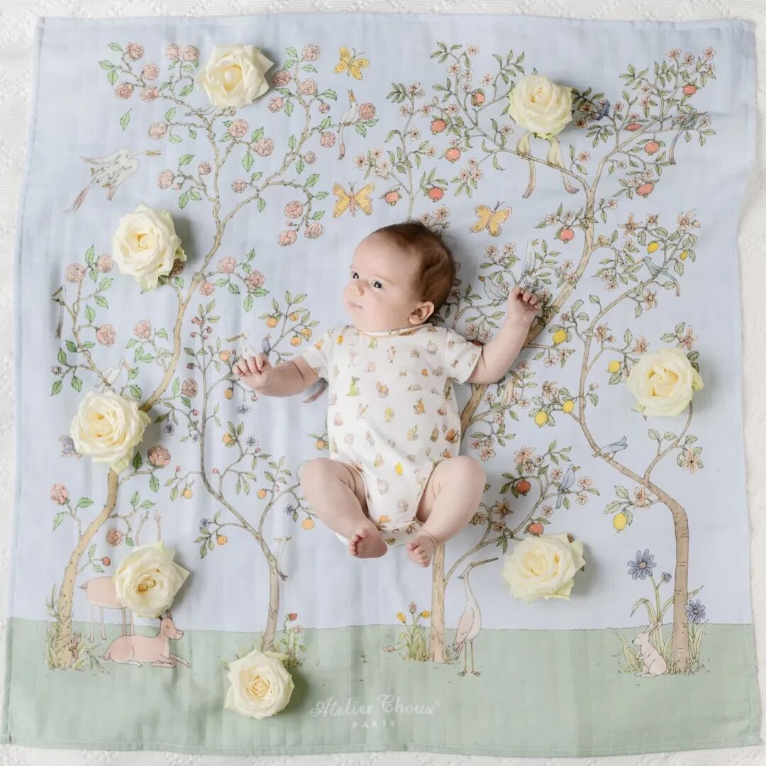 从花样众多的有机棉包⼱、寝具到服饰⽤品,每一件Atelier Choux柔软的有机棉都经过了法国传承百年的手工艺裁剪,采用意大利水性油墨印染和特殊的锁色技术保证插画的原色,艺术感、三维感觉强烈。
