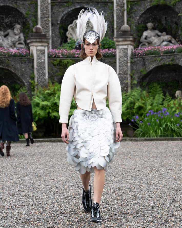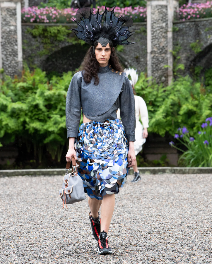 路易威登2024早春女装秀将此次秀场打造成一段书写当代童话的旅程,以新颖的视角演绎成群游弋的生物登陆探寻奇遇的故事。经过在岸上的游历,水中生物吸收着所遇之物的影响不断发生演化,渔民的下水裤、氯丁橡胶潜水服的影子也渐渐呈现。而风格柔美的礼服则是“到最后,美人鱼变成了一朵花”的诠释。夸张的头饰和面具为整个系列增添满满的奇幻色彩。