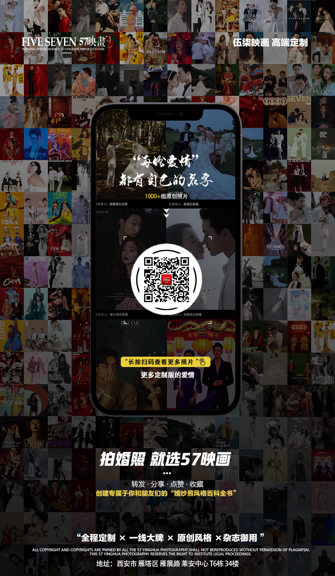 作为西北知名高端定制婚纱摄影品牌,伍柒始终以特立独行的“伍柒风”深受百万新人喜爱,原创定制风格一直是我们的精神信仰以及品牌灵魂,2022年伍柒全年研发样片超1800张,创新不止,持续研发更多美好