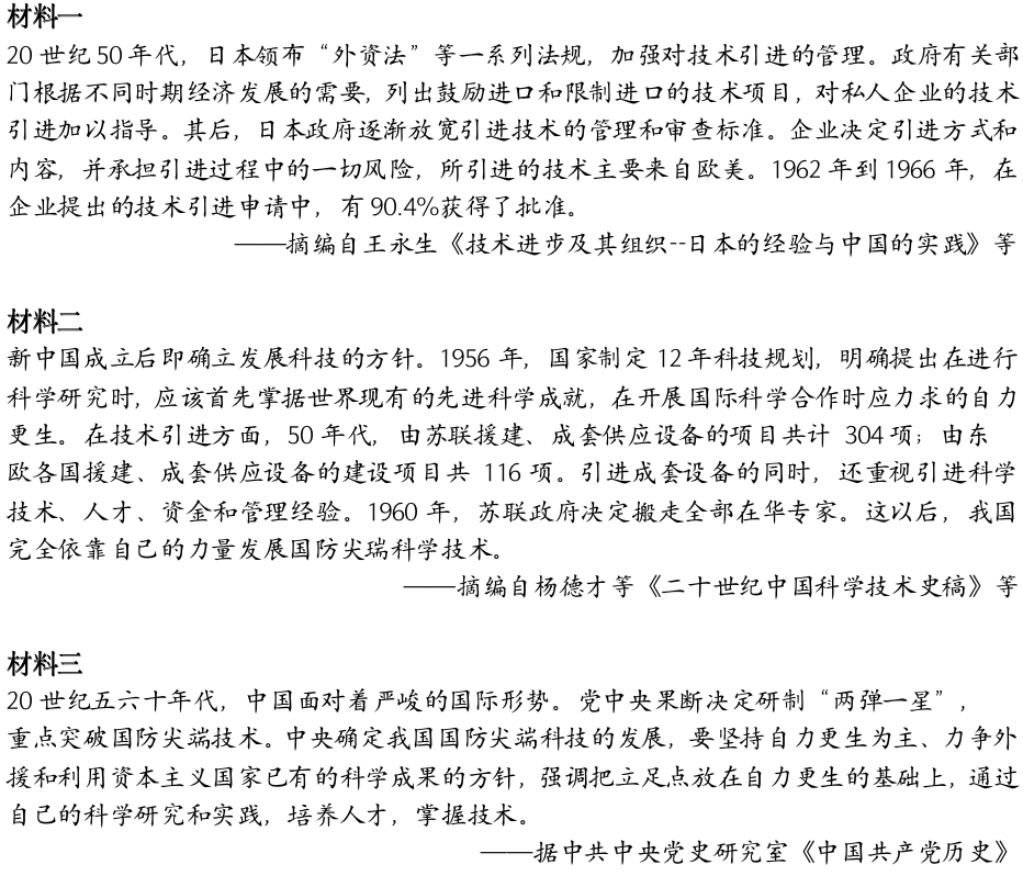 (1)根据材料一、二,概括20世纪五六十年代中日两国技术引进的特点。(点击源回答查看参考答案)
