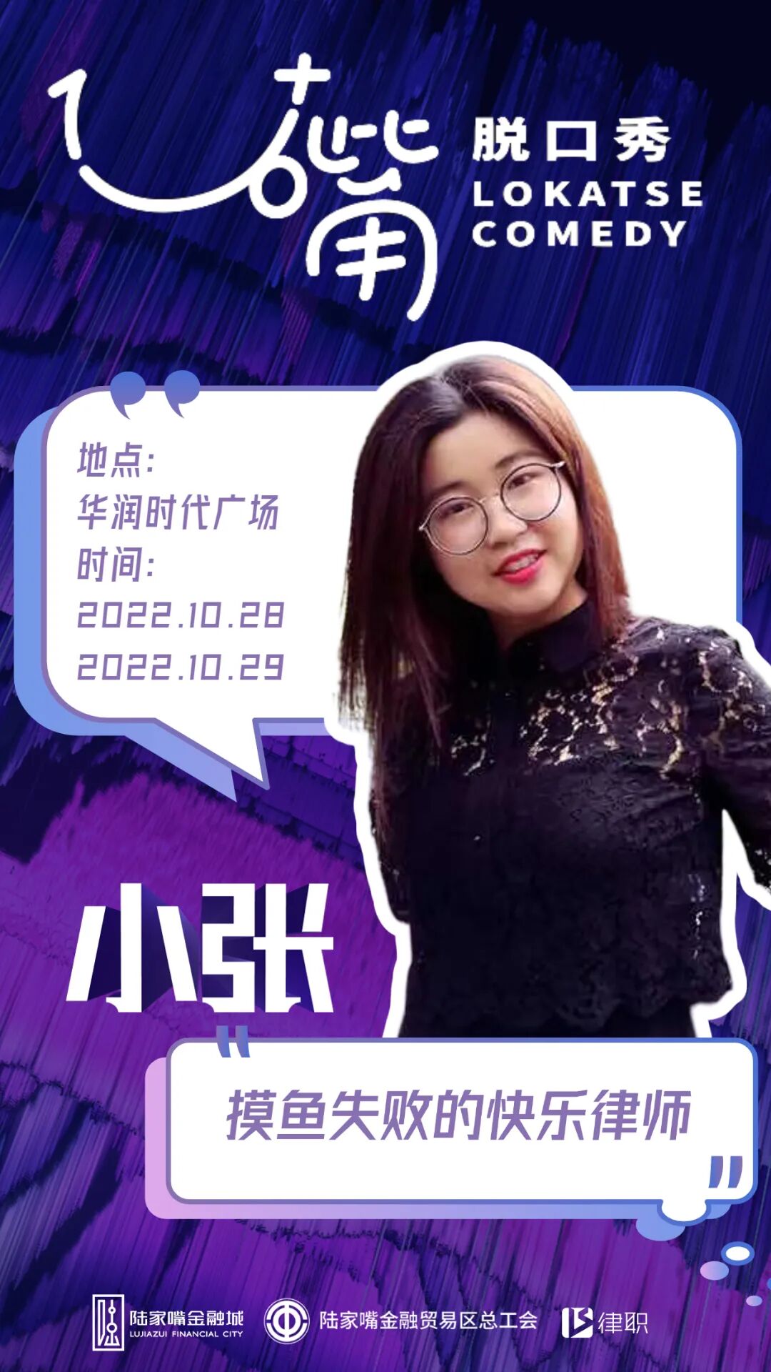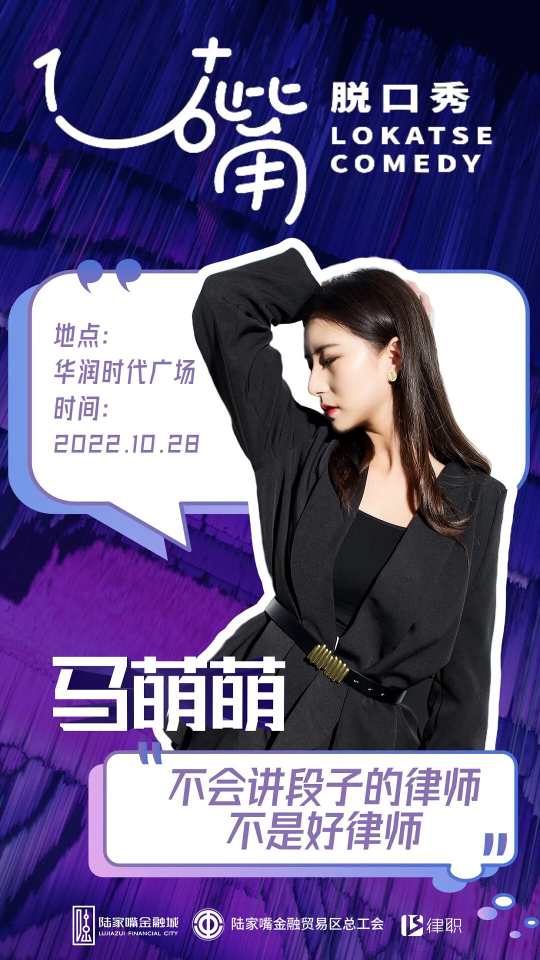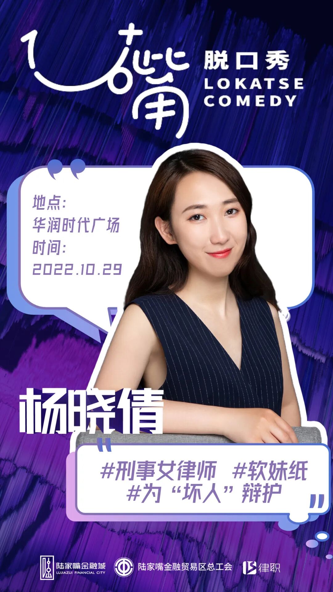 去年,浦东第一个本土脱口秀厂牌“1U+嘴”已在金融城落地开花。这次陆家嘴又带来了“新玩法”:第一场行业主题——法律人脱口秀即将登场!