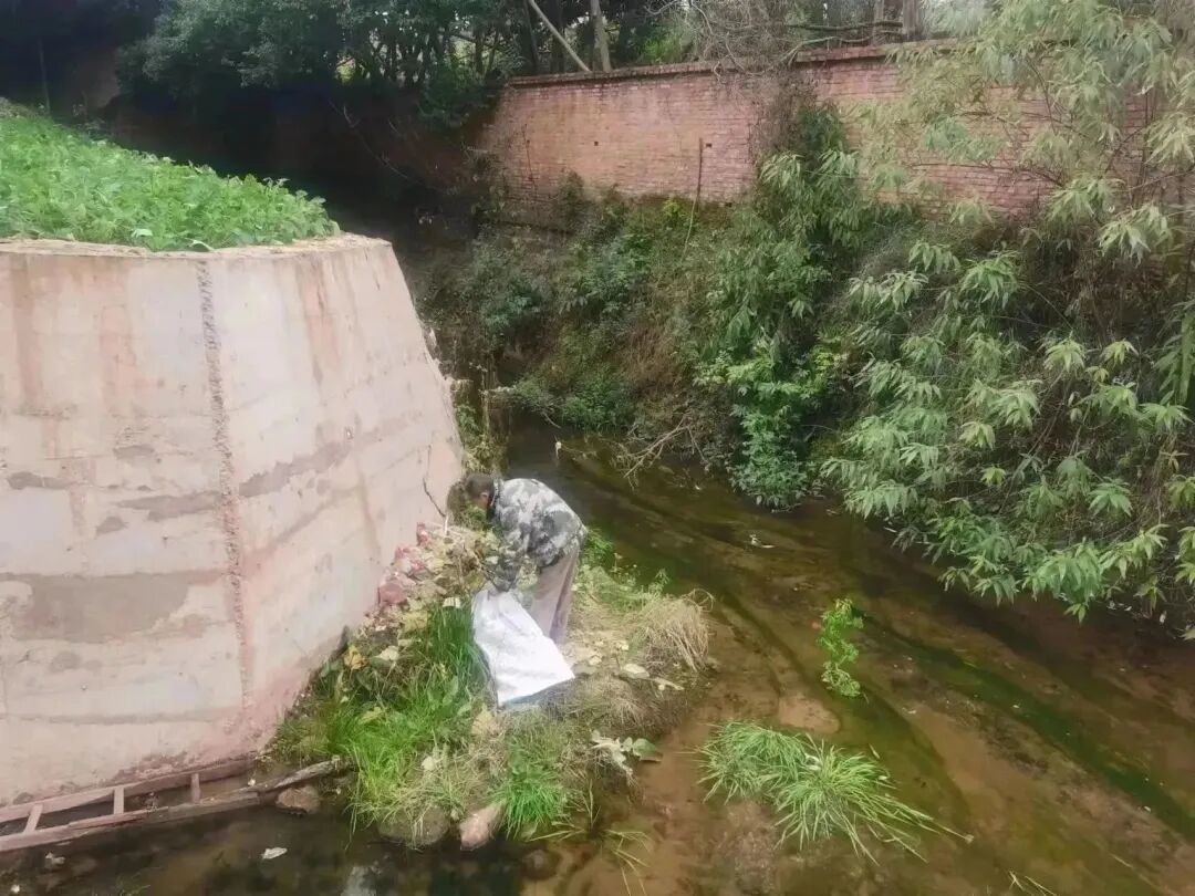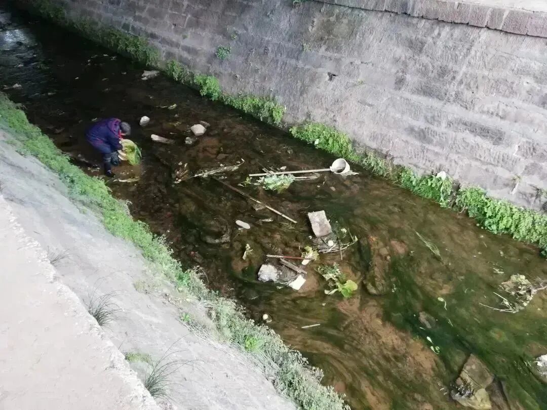 △红咏社区居民志愿者对百工溪河道内外垃圾进行清理