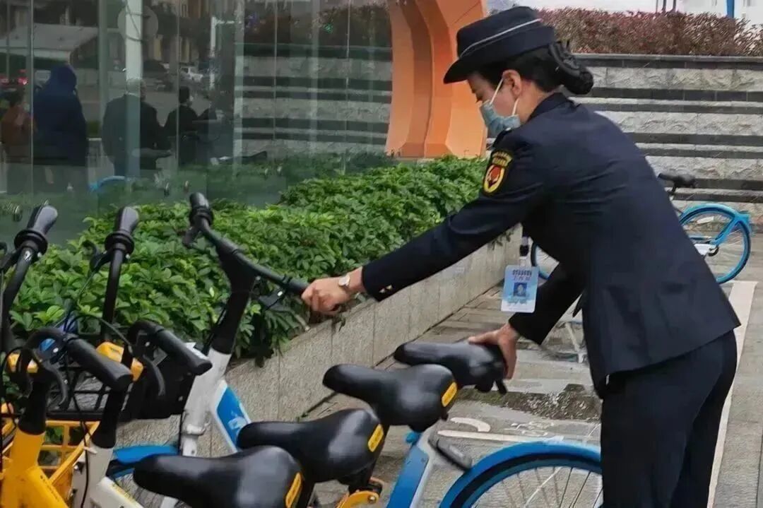 △街道执法队员对乱停乱放共享单车进行规范摆放