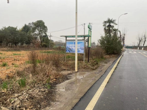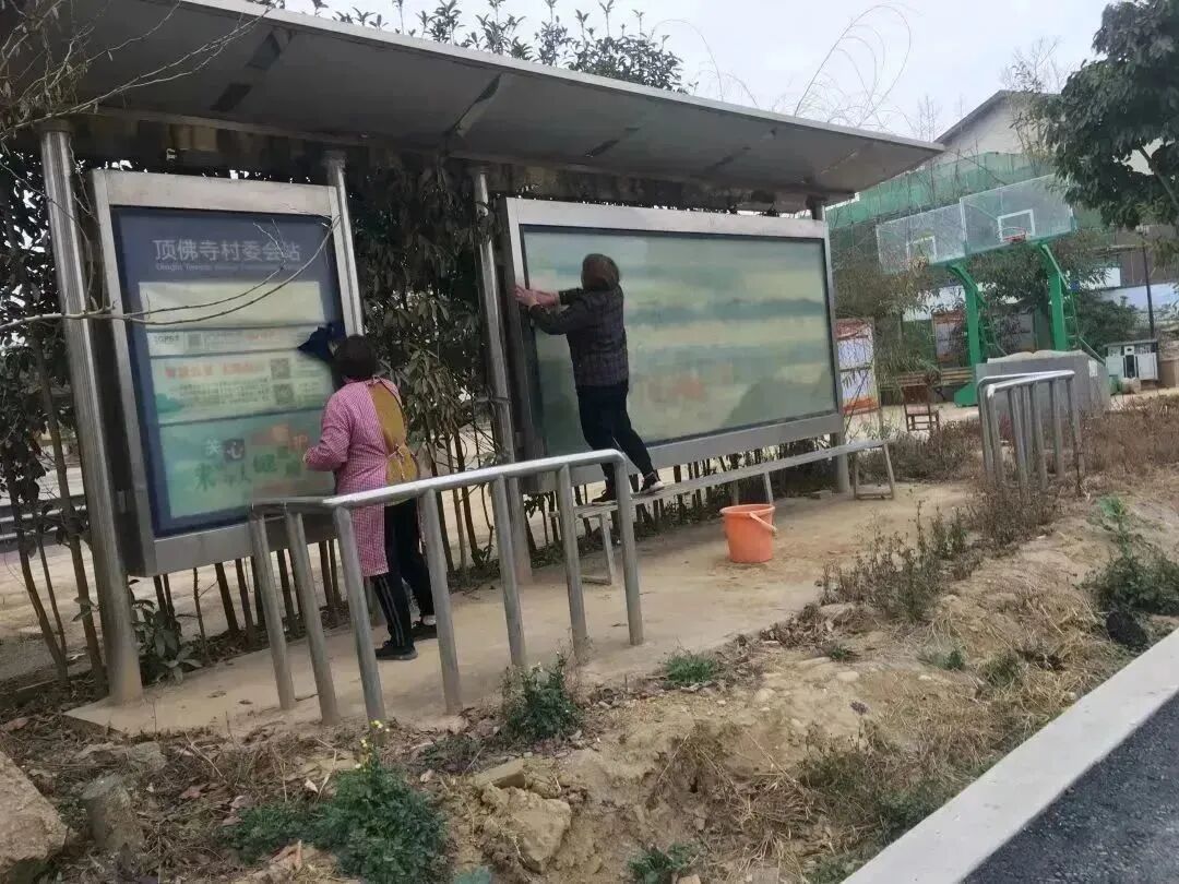 △顶佛寺村居民志愿者对道路两旁枯枝秸秆、垃圾杂物进行清理,并将辖区公交站牌细致擦拭干净