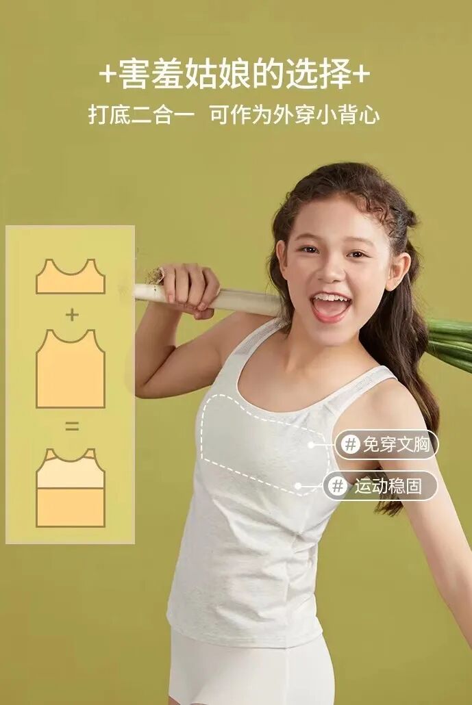 尽管在医学上没有应该穿内衣的严格界限,但胸部开始凸起就表明可以穿内衣,如果因为胸部发育而感到扭捏,提前穿也是没什么问题的。化繁为简,避免成人感的内衣版型,让内心害羞或害怕的女孩更易接受,愿意穿着来保护“小花蕾”。柔韧软弹力面料,如拥抱般温柔体贴,舒缓发育小情绪,只留美不留痕,没有过多繁杂的缝线,平整无摩擦的工艺,给身体无压的自由。超时尚点睛字母印花融入款式中,给基础内衣带来新的活力,打底内搭外穿背心皆适宜。
