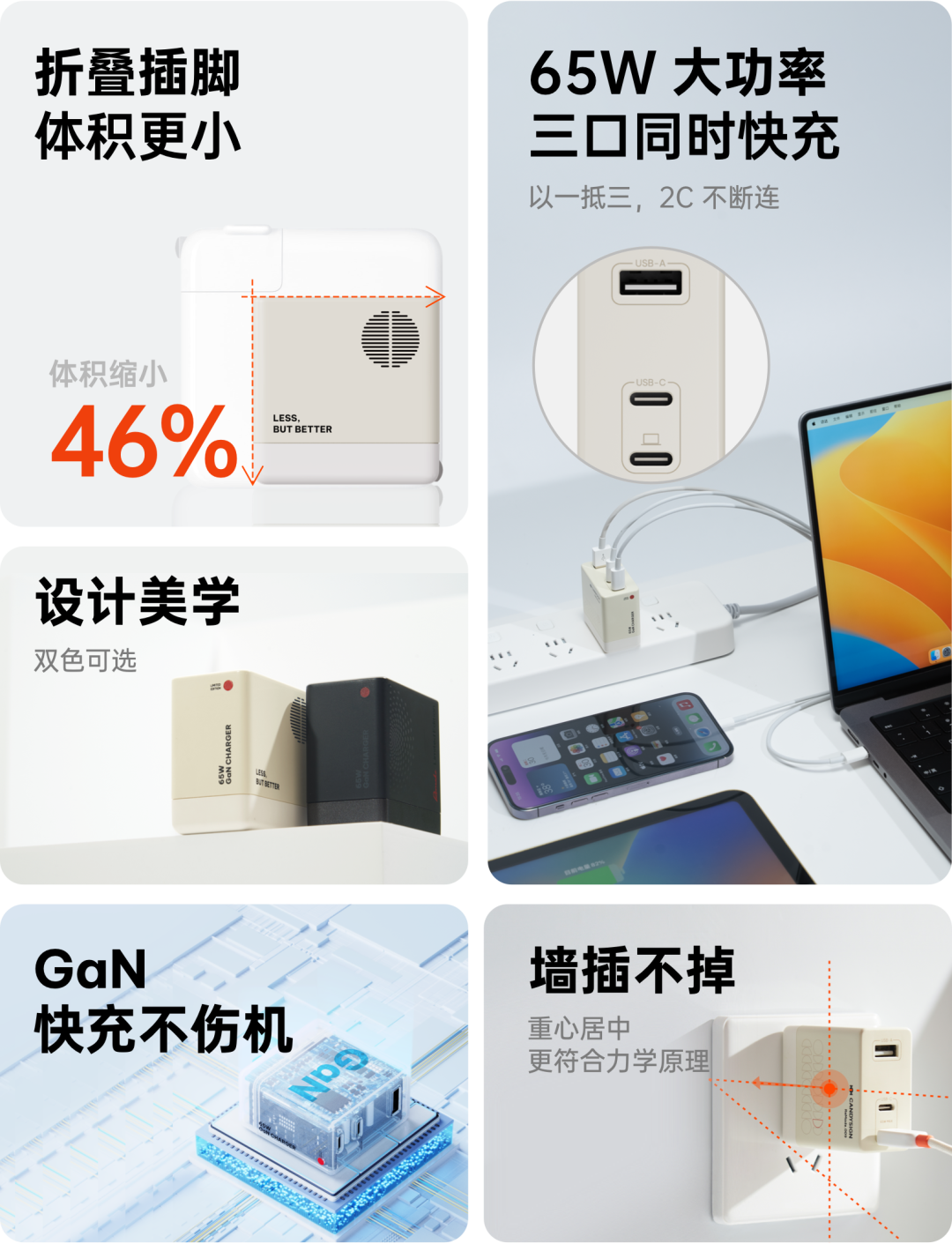 我们始终相信好产品不仅是功能需求的满足,更能给带来愉悦。从35W到65W,我们一致采用G2R角的设计,我们相信柔和流畅圆角让人更愿亲近和触碰,G2R的保留,是我们对好产品的固执追求。