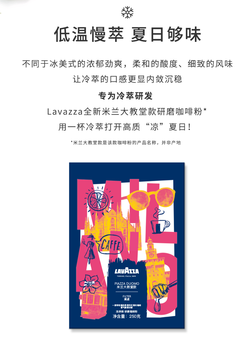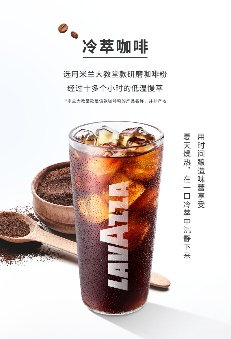 仅限有此产品供应的LAVAZZA咖啡店,具体情况以咖啡店餐牌公示为准。产品及包装以实物为准。M=320ml。“升级冷萃咖啡”指自2023年5月30日起冷萃咖啡将采用【米兰大教堂款咖啡粉】。