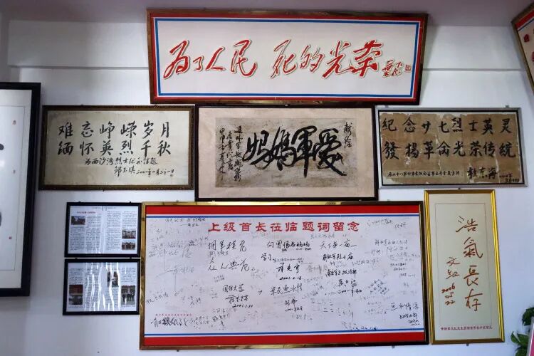庙旁的纪念馆里布满了旧时照片,记录了解放军庙建立至今来参观过的名人照片,以及解放军庙的由来。庙的正前方立着一尊解放军抱着小女孩的雕像,这个小女孩就是当年被解放军救下的曾恨。