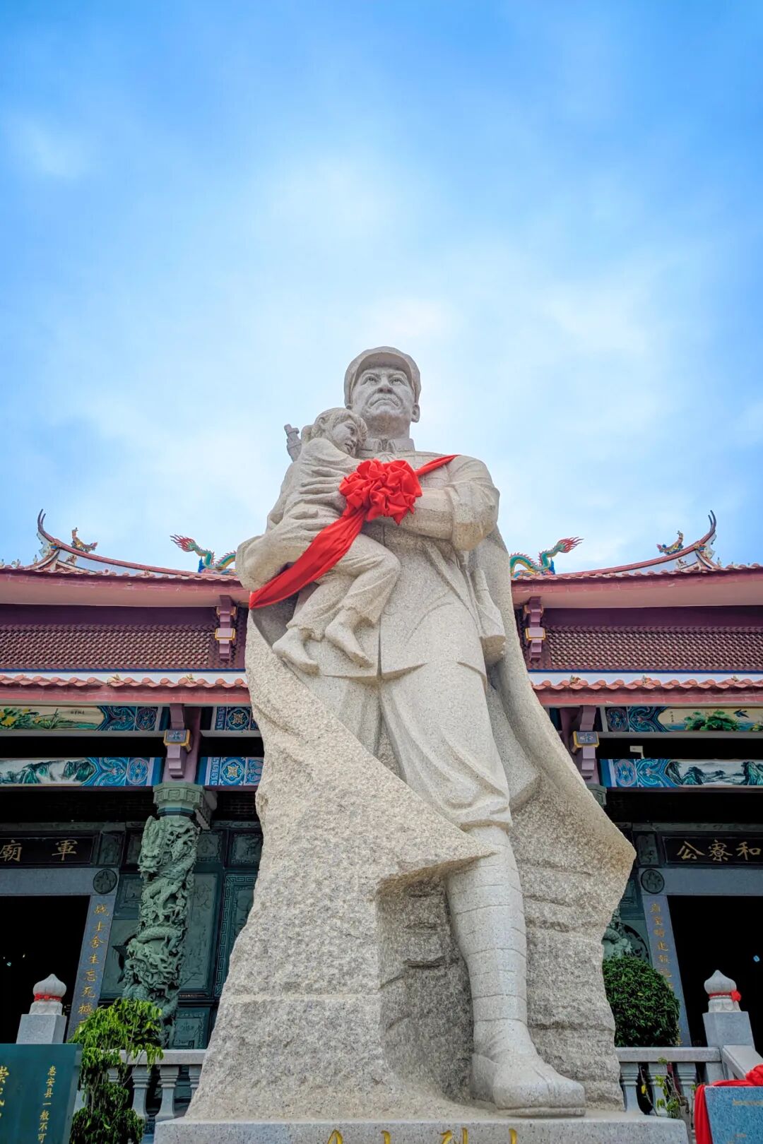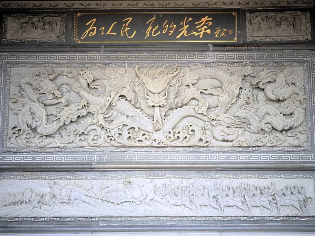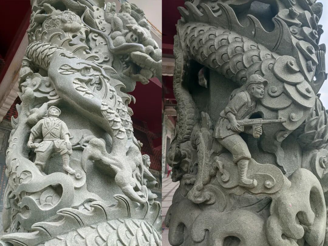 解放军庙沿用了红砖白石与燕尾脊的闽南传统建筑形式,门楣上悬挂着黑底金字横匾“天下第一庙”。但最吸引我们目光的,还是这块足有10米长,描绘着解放军英勇抗战,舍生救人场景的石雕墙。庙门两侧的墙面上也嵌满了石浮雕,与一般寺庙不同的是,左右两侧的镂空石窗上面附有金色的中文“八一”字样,就连庙前的石柱,也都栩栩如生雕刻着解放军的形象,这些独特的细节让人感受到建造者的满满用心。![]()