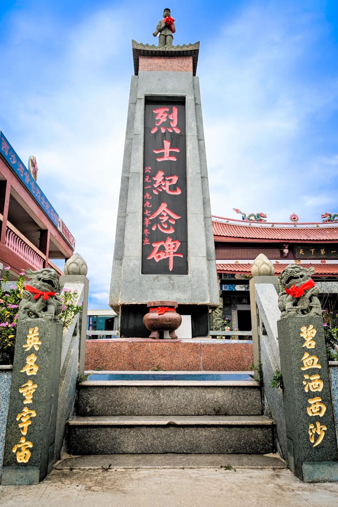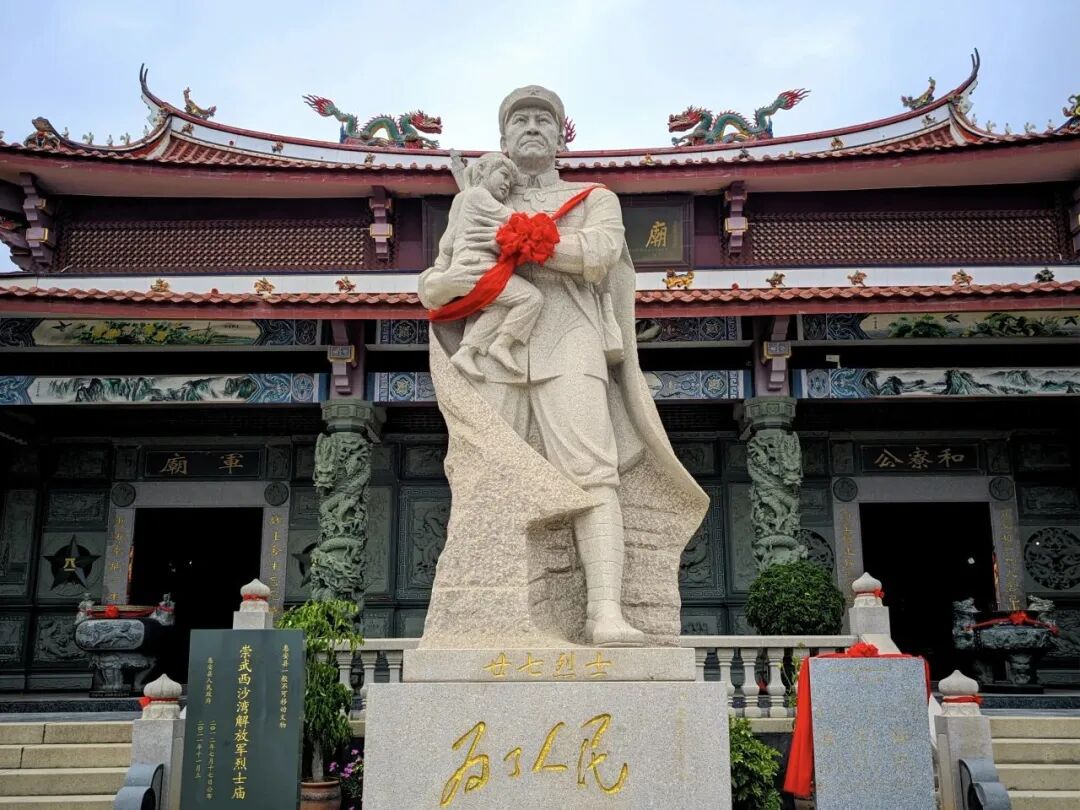 雕像左前方则是烈士纪念碑,通高8.1米,象征含义不言而喻。“烈士纪念碑”5个大字由28军老战士所书,背面为叶飞将军亲笔题词:“为了人民,死的光荣”。碑顶挺立着一尊解放军战士雕像,手握钢枪,面向大海,披星戴月,保卫人民。解放军庙的建立,像是百姓对解放军战士的感激回报。不过自打新庙建起,当地百姓纷纷加入拜扫的行列,将解放军战士奉为神佛敬畏。解放军不信神佛,但当地人却用最朴素、常见的方式将他们祭祀起来,寄托着当地人纯真美好的情感,可以说是在民间信仰中独树一帜了,难怪敢称为“天下第一庙”!