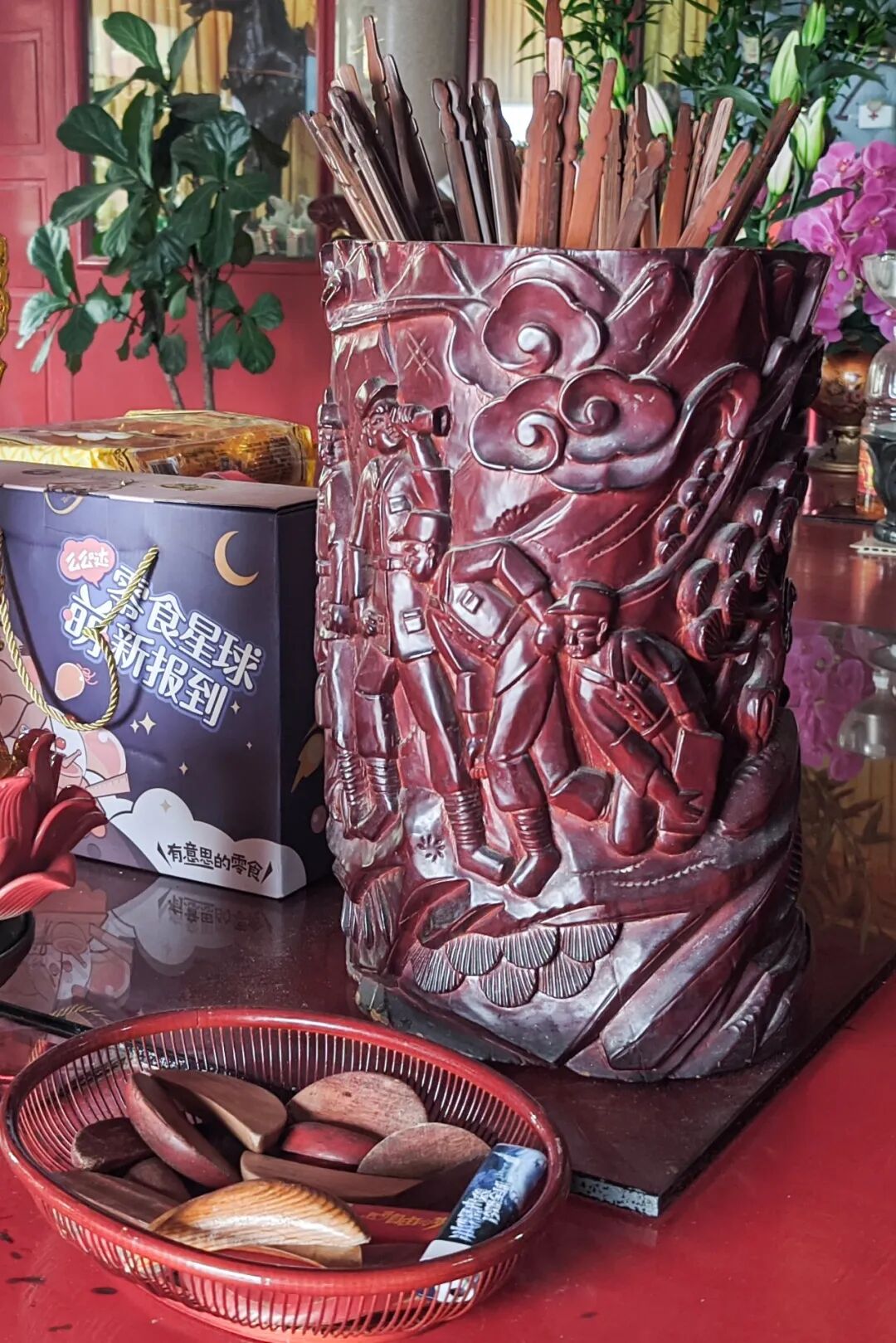说到闽南寺庙,人们总会联想到烧香、打卦、掷签、占卜,解放军庙也如此。然而不同的是,这儿的签桶上也刻着解放军持枪伏击敌人的画面。