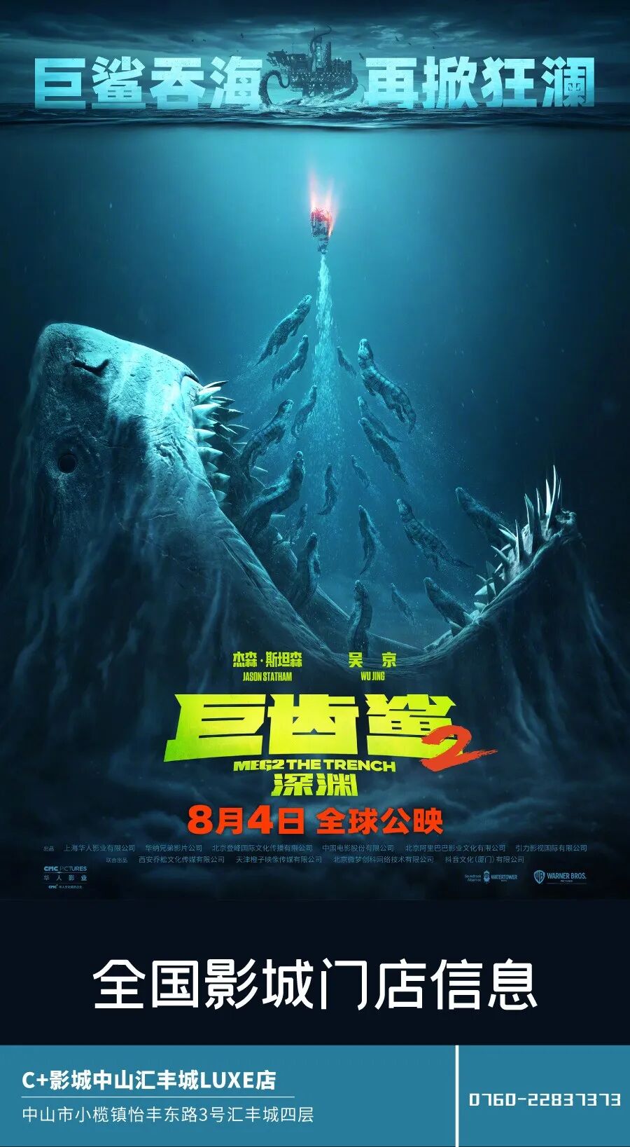 由本·维特利执导,杰森·斯坦森、吴京主演的深海怪兽国际大片《巨齿鲨2:深渊》发布定档预告及海报,宣布将于8月4日全球同步上映。此次既有老伙计杰森·斯坦森回归,也有新朋友吴京加盟,中外两大硬汉将在这部国际大片中迎来首度合作,强强联手对抗深海最猛巨兽。