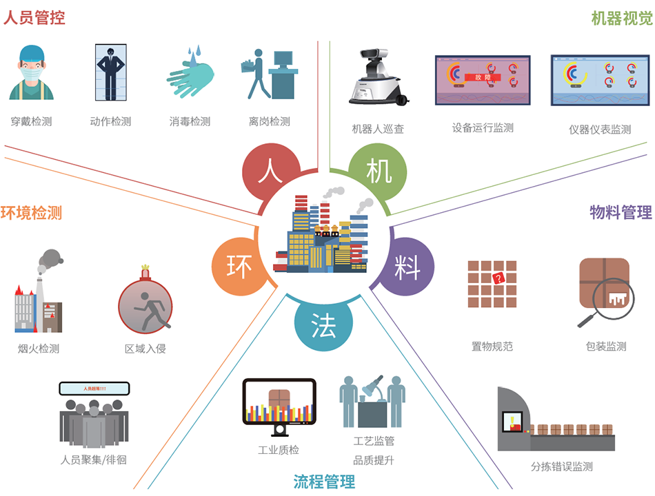 “人”、“机”、“料”、“法”、“环”,是制造业中的五个影响产品质量的主要因素的简称。基于这5个因素,日立解决方案智慧园区事业部,以AIoT技术为核心,利用AI图像分析技术,通过分析摄像头获取的人、物的图像信息,实现自动化的监控、识别、管理等功能,用于协助生产的各个环节,强化安全生产,提升管理效率。
