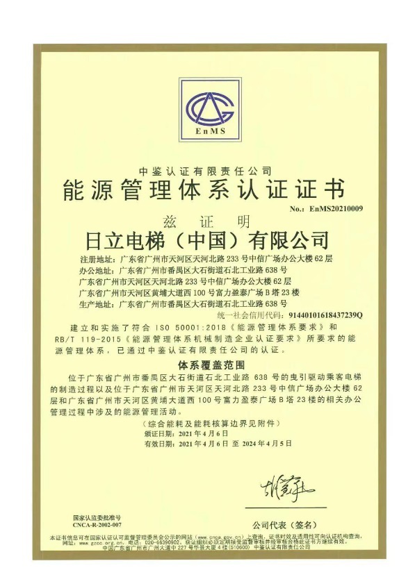 为提升能源管理能力,实现节能降耗,日立电梯(中国)有限公司(以下,简称日立电梯)启动ISO50001:2018能源管理体系的建立运行和认证工作,通过体系运行和实施,制订多份管理文件,搭建能源管理系统,开展专业培训,寻找节能方案,提高能源使用率,在2021年,日立电梯获得ISO50001:2018能源管理体系认证。