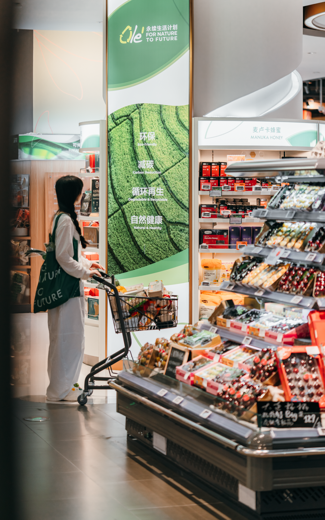 围绕永续理念,2023年4月30日,Olé首家低碳实验店在深圳启幕,打造集环保、自然、健康于一体的绿色购物空间,同时营造「环保可持续」、「绿色低碳」、「减负自在」消费场景,与消费者共同打开日常的“可持续”灵感。