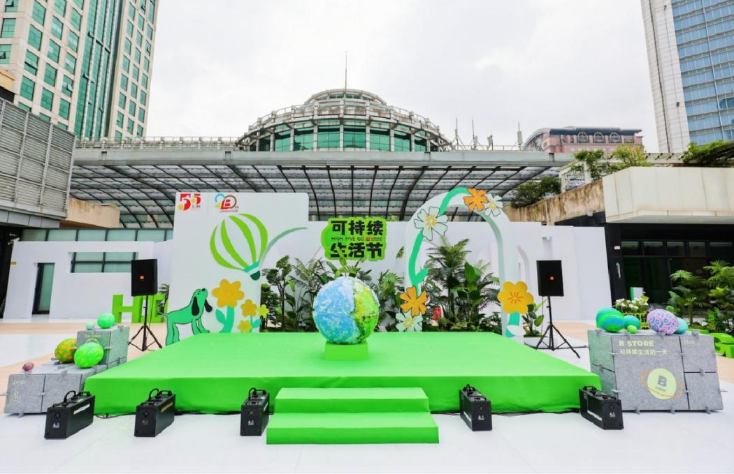 2023百联股份打造可持续⽣活节HIGH FIVE GO,兴绿色消费理念,行循环利用准则。五五购物节期间,于六合路打造可持续市集、可持续艺术连廊及可持续露台,融合⽣活、环保、时尚、艺术元素,为消费者带来多元的绿色互动体验,倡导可持续生活方式。