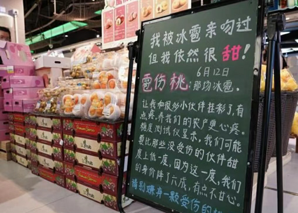 2022年6月,北京有1300多亩平谷桃园遭遇冰雹,第⼀时间,盒马迅速成立了助农专项⼩组,经过⼀番考察后,盒⻢决定选择被冰雹伤害不超过6处且保持完整形状的桃⼦进⾏品牌包装,取名“雹伤桃”,在北京43家门店同步售卖,⽽对于无法成为“雹伤桃”的桃⼦,盒马则利用冻⼲锁鲜技术,将相关产品提供给消费者。