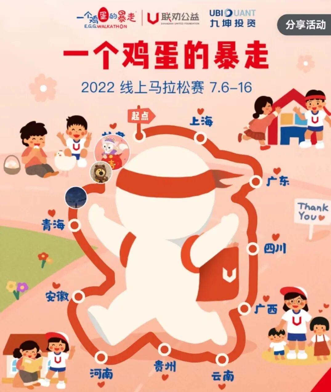 本次一个鸡蛋的暴走线上马拉松赛全程50km,共设置了10个卡点,分别为上海、广东、四川、广西、云南、贵州、河南、安徽、青海、甘肃。这10个省份也是“一个鸡蛋的暴走”公益项目12年来累计资助金额前10的省份。