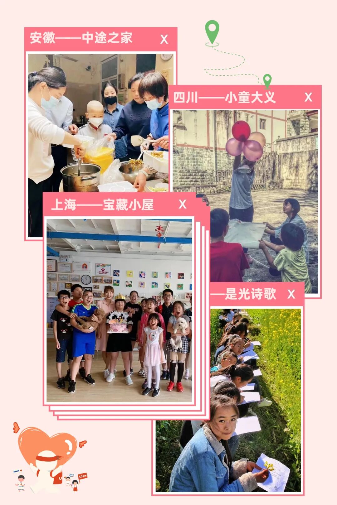 每到一个卡点你将了解到在这些省市正在发生的公益故事,在不能前往更广阔世界的日子里,希望这些因为给予带来的美好改变,能让你收获互助的美好,感受到彼此点燃的力量。