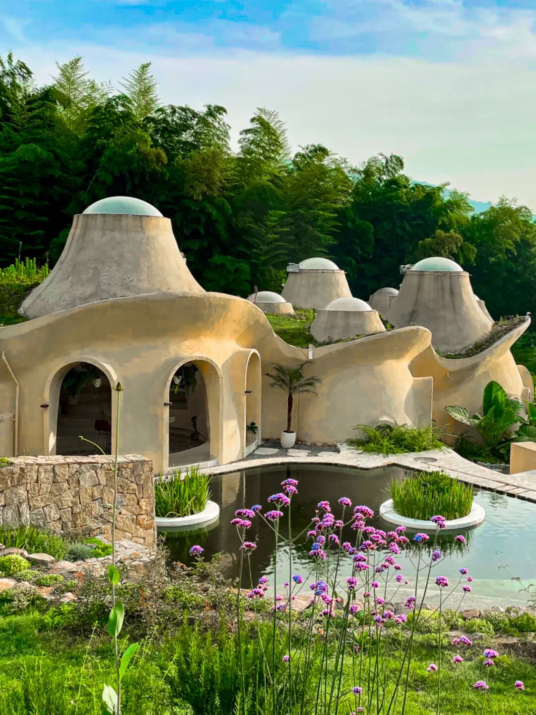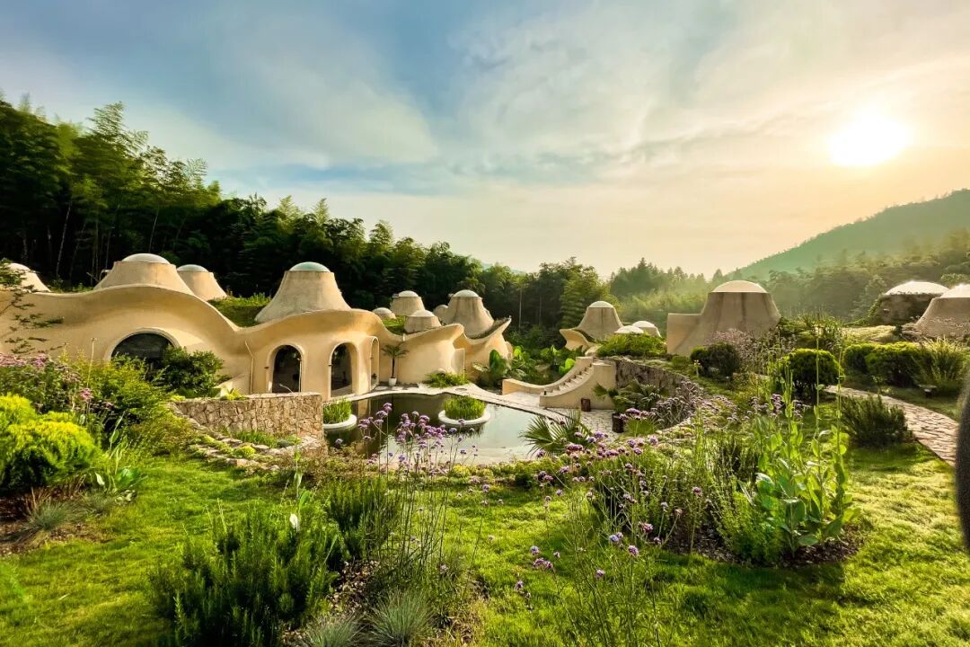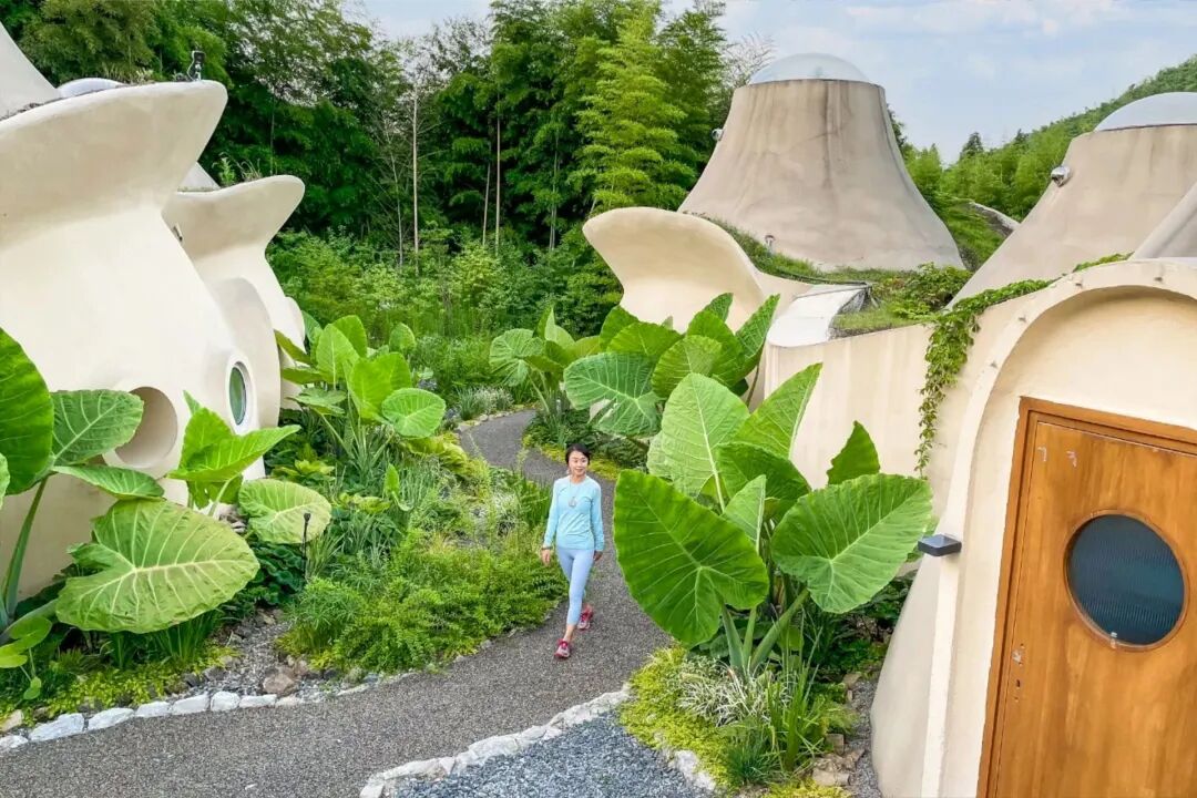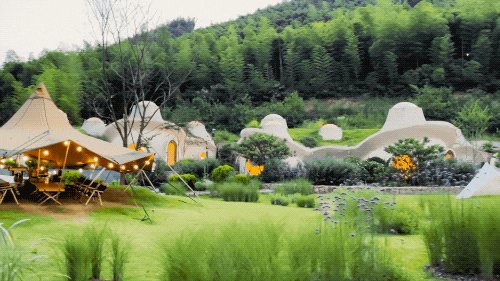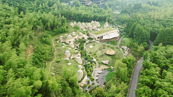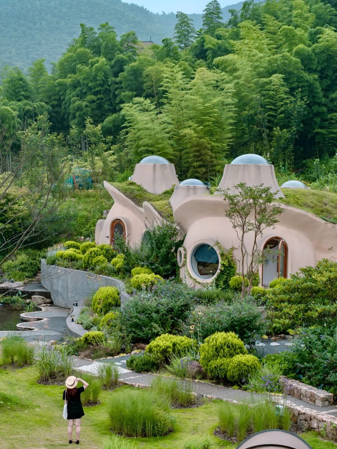 湖州野界森林度假酒店选址在湖州吴兴区妙西镇妙山村,这里有着“七山二田一分水”的美誉。酒店占地35亩,与霞幕山为邻,四周围绕有密林竹海,四季都容纳山水灵气,真实演绎了“向野而生,与自然无界”的避世意趣!酒店整体设计突破常规,耗时3年采用覆土建筑的形式,打造了野奢魅力的“穴居客房”,让人仿佛来到了外太空。13栋villa依靠山坡的走势高低,散落在山谷中,绿色的屋顶是天然草坡,连绵起伏间构成了一幅绚烂油彩画。![]()