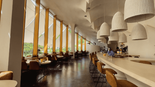 入住野界,不止一夜休憩的安眠,还有可口美食的慰藉。一日三餐在这里都能妥帖安排,就着山野美景用餐,是一件浪漫的事儿。餐厅外观设计为“破土而出”的半弧形建筑,仿溶洞的造型充满了庇护感,一整面的采光玻璃墙让阳光照进餐厅的每一个角落,倍感温暖。内部则借鉴了地中海式的建筑风格,内设有吧台、临窗桌椅、壁炉聊天休闲区,定制的飞碟灯、国际品牌酒店同款WMF刀叉、随处可见的花卉绿植盆栽、全天的咖啡香气,每时每刻都是美的享受。