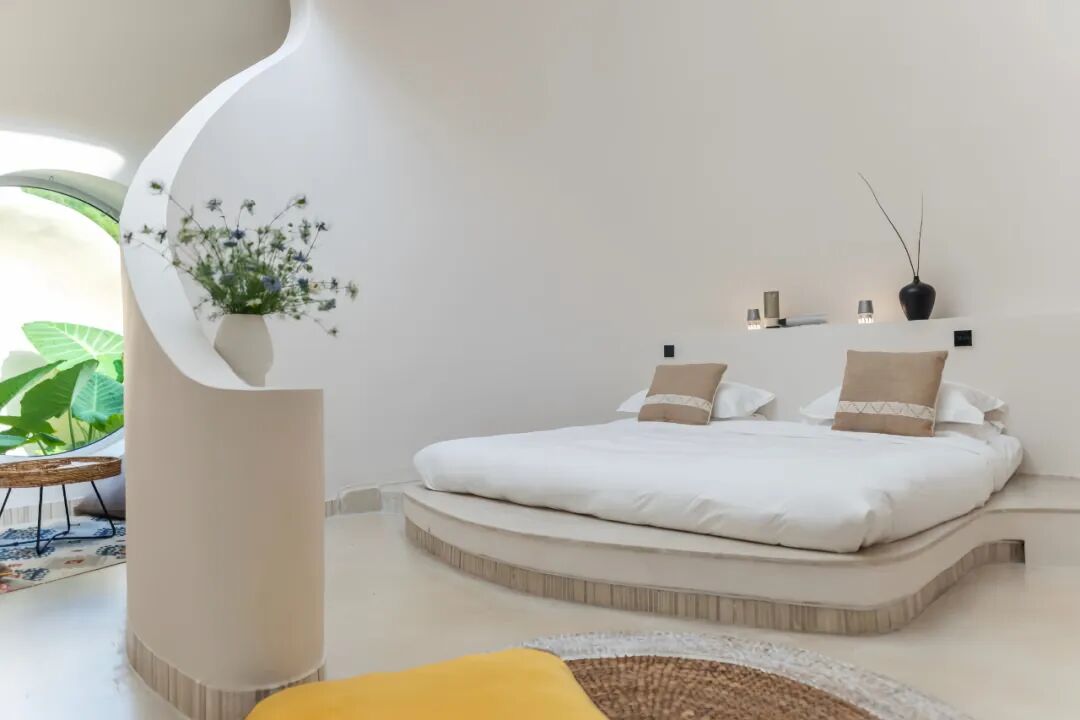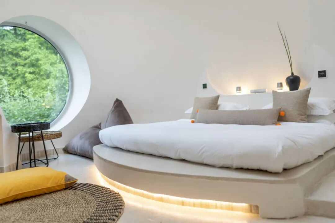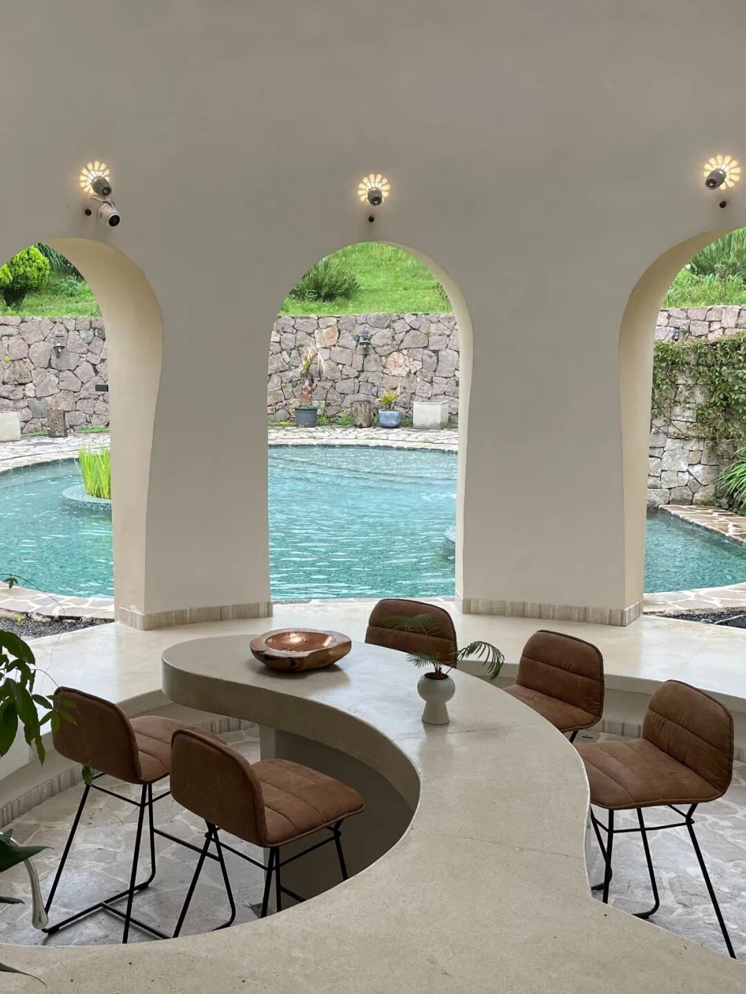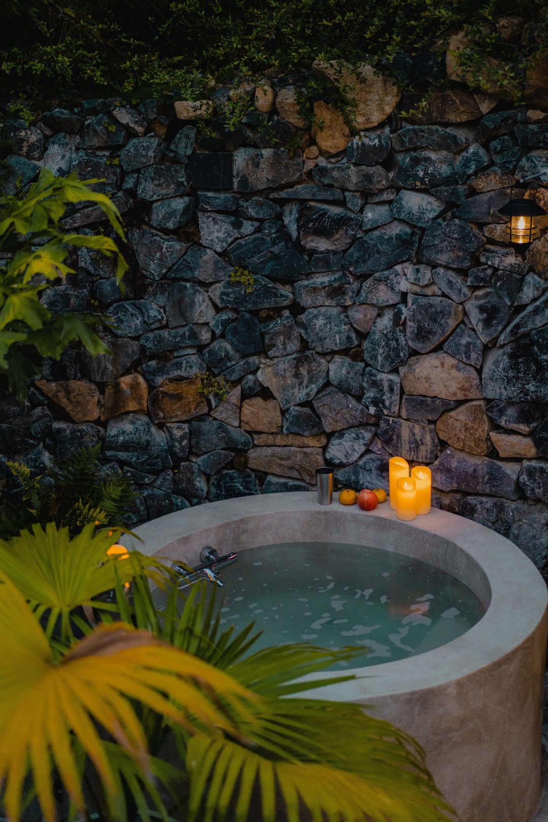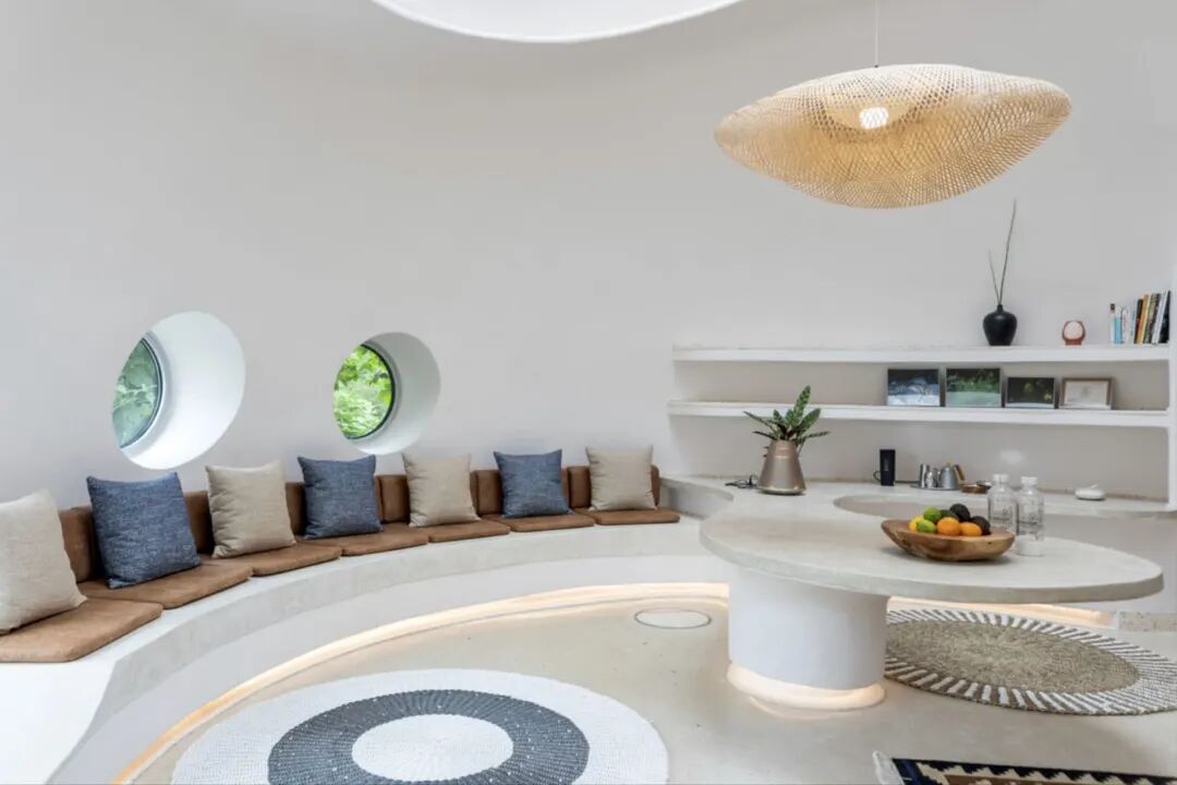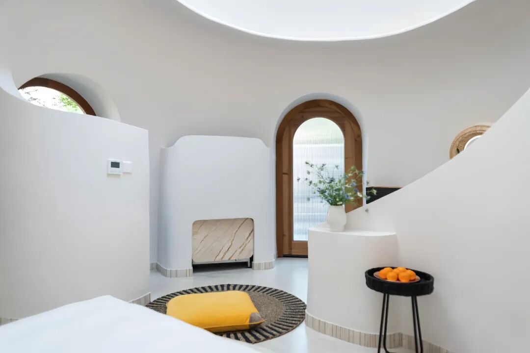 酒店内部是由200多种植物打造的花园庭院,以潺潺音溪流和蜿蜒石径串联,装饰着客房的前庭后院,不同季节都有不同景色,仿佛闯入了童话中的秘境花园。山野之趣不止于优越环境,还融入了野界生活的方方面面。露水鲜花被采摘来装点餐厅,新鲜薄荷叶被制作为迎客柠檬水,香草花园新鲜迷迭香被用来腌制牛排...每一刻时光都浸润有治愈能量,让你沉浸在浪漫度假氛围中。酒店仅打造有13间洞穴型Villa,低密度人居隔绝了人声喧闹,代之为鸟鸣蝉叫,给你承包整座山谷竹海的感觉,覆土建筑也让室内空间实现”冬暖夏凉“的恒温效果。客房分为雨林、秘境、花园、庭院4种房型,面积60~90㎡不等,自带室内或户外的私汤泡池,池水取自天然深岩层泉水,给你深层次的肌肤呵护。客房还自带天窗,白天接引将自然光,让室内拥有通透质感,夜里抬头即可仰望漫天繁星。圆形窗户代替了墙面,窗外是花卉绿植,靠着懒人沙发看书喝茶,惬意悠然。客房面积50-60㎡,客厅、起居、洗漱区各功能区线条全部由圆形或弧形组成,以纯白为主色调,以橙色提亮,再以绿植盆栽点缀,让整体氛围干净清新。还有全热新风系统,给每位住客带来持续的新鲜空气。日本原产的Aoyoshi青芳手工茶壶、DAEWOO便携式烧水壶、雅马哈无线蓝牙台灯环绕闹钟音响、Baseus小冰箱…房内软装从布草、摆设到备品,都是精心挑选的。洗漱空间同样出彩,无遮挡设计的洗漱台是由手工打磨的,inus智能马桶、私汤浴缸、瑞士品牌Spierlla漱口杯...给你舒适入住感。客房面积90㎡,整体空间更宽敞。配有一张2.2米特大床,可轻松入住2大1小或3位成人。客厅窗前设有长塌,卧室窗前摆放有懒人式沙发靠椅,让你足不出户随时赏风景。酒店遵循环保理念,客房内的所有水均为引用级净化软水,无论是气泡水、咖啡机用水、还是洗浴用水,均符合最高等级的饮用水检测标准。入住后产生的废弃物,酒店将会回收处理,再重新回归自然。