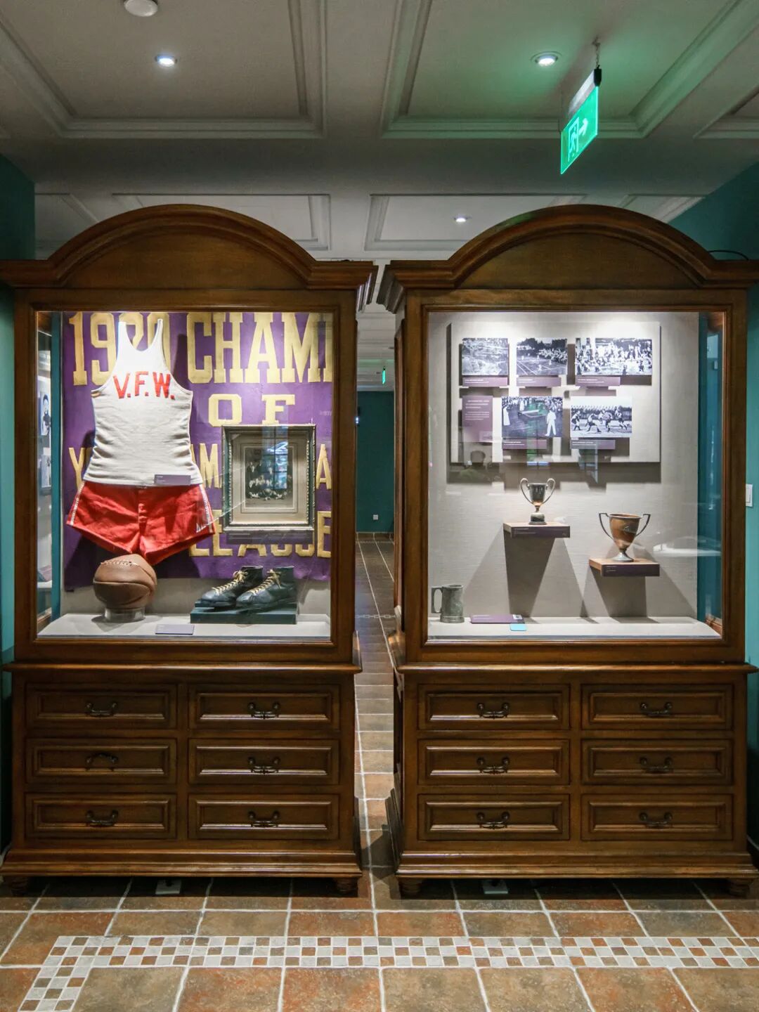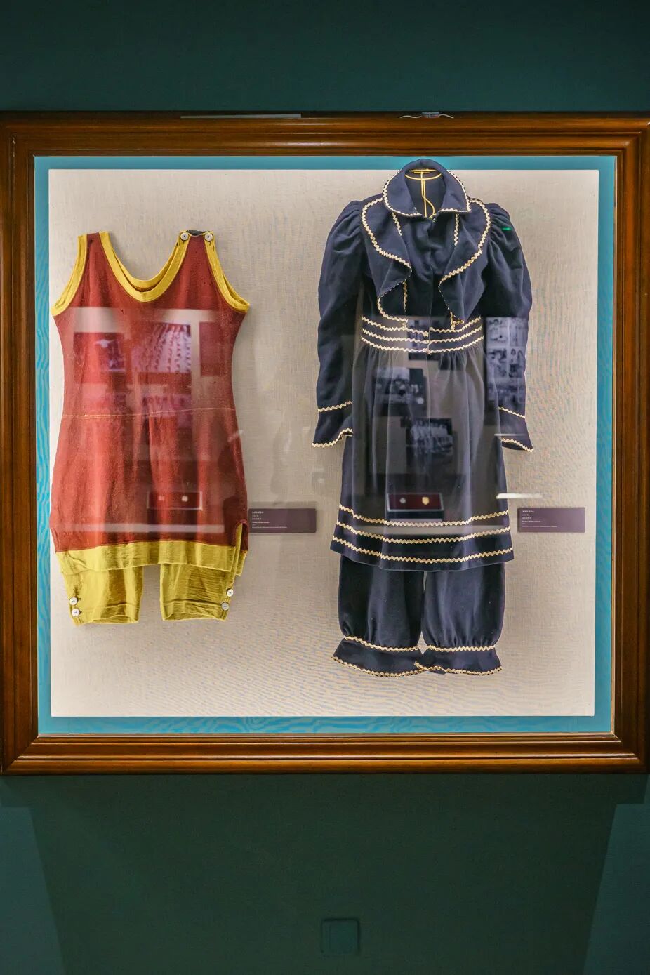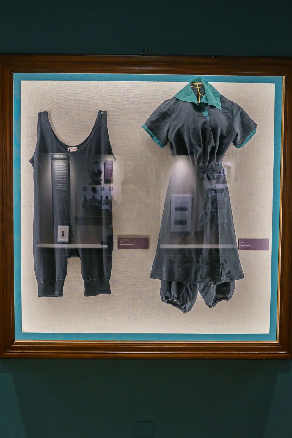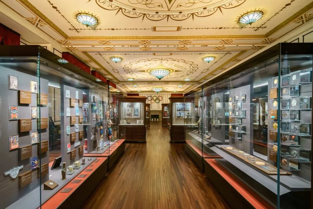 一楼的中庭原为建筑天井,是当年汽车邮运的场地,目前陈列着大清邮政马车,邮运汽车火车等模型,不过只有周末开放,前来参观的话请注意时间。参观预约:“红途”小程序搜索“上海邮政博物馆“,门票免费南京西路上国际饭店买蝴蝶酥的队伍排了一圈又一圈,不过可千万不要错过它“贴隔壁”的体育大厦,这里是上海体育博物馆的所在地。这座原西侨青年会大厦,是一座上海不多见的马蹄形建筑,拥有华丽大气的舞厅和蓝色玻璃穹顶——它也是体育博物馆最大的一件展品。大楼前面由凹凸条状及菱形图案构成,门窗采用罗马式券形及古典柱式,是让人过目不忘的折衷主义风格建筑。上海是中国近代体育发源地之一,首先出现的是赛马这项运动——就在体育大厦对面的原上海跑马总会,存在了101年。此后赛艇、台球、乒乓、射击、足球、篮球等各种运动,在上海相继出现,并从租借向华人社会扩散,由上海向周边扩散,直至发展出中国近现代值得一书的体育事业——体育事业与国家民族的命运,是如此息息相关。这里收藏了不少古早运动用品,比如你以为的大衣,竟然是当年的泳衣。