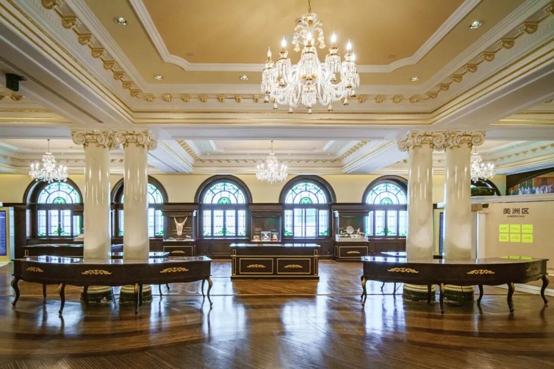 走进二楼的礼查厅,第一眼就会被现在几乎绝迹的大提琴状弹簧木地板所吸引,踩在脚下的地板,不知见证过多少华丽宴会。同楼层还展出着1910年的浦江饭店地板和砖面,静静诉说着这座历史建筑的光辉岁月。中国证券博物馆设立于此,颇有一种今夕交融的时间感,仿佛一曲“浪奔,浪流”的《上海滩》,在脑中奏响。上海天花板中的天花板