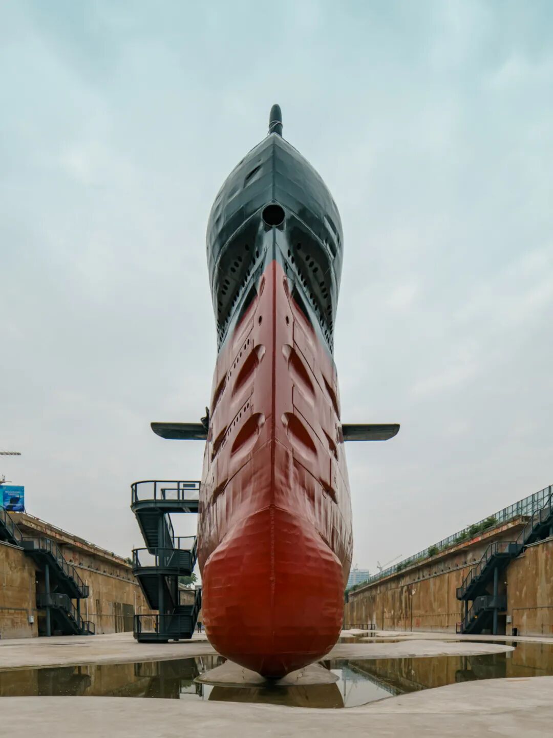4月23日,上海潜艇展览馆(中国航海博物馆黄浦分馆)正式对外开放。当天,正是中国人民解放军海军成立74周年的纪念日,我国第一代自主设计、研制的035G型常规动力潜艇,在原江南造船厂旧址,揭开了神秘的面纱。进入馆内,“长城191号”静静地停泊于3号船坞内,但“大国重器“带来的压迫感还是扑面而来。干船坞底的水景设计由芬兰PES建筑设计事务所打造,呈现了逐渐起伏的地形和水位的高低变化,配合红黑涂装的潜艇,可以说是怎么拍都好看。试营业期间,潜艇展览馆分不同时间段限额参观,且有专人讲解,因此参观的体验非常好。在“深海利剑”的展览部分,可以先一览我国潜艇事业的发展史,对潜艇的内部结构有大体的了解。