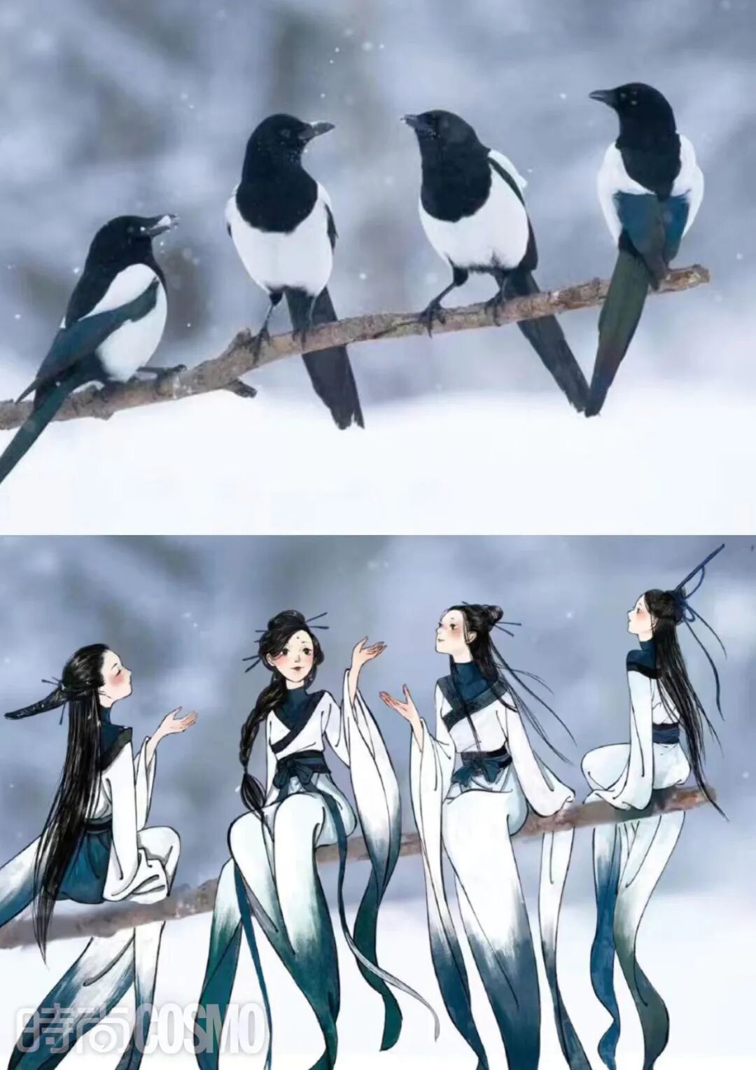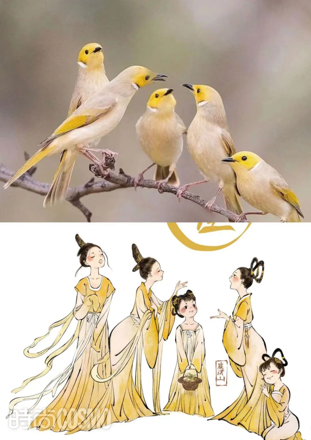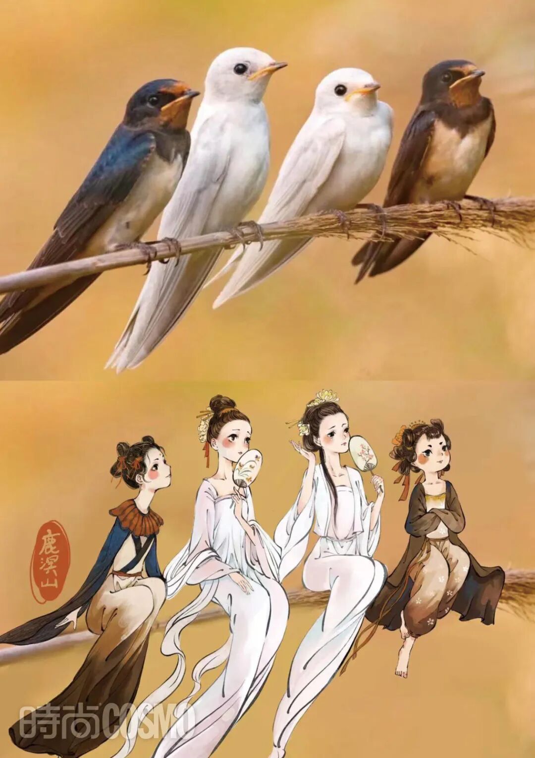 但凡在搜索栏里输入“鹿溟山”这个名字,必定会跳出一系列同“小鸟拟人”几个字眼相关的内容——一只只小鸟幻化成人形,神态灵动,异常可爱。这个系列的创作始于一次和父亲的温情故事,因为爸爸生病需要住院化疗,鹿溟山会在他的病床前陪伴守候,她想着画点轻松的内容打发时间,便开始在纸头上随意画稿。那段时间,画画的前辈也来给她建议:“你的整体风格已经很好了,但是基础人体这块还可以再补一补,加强一下。”于是鹿溟山便在《国家地理》杂志中看到小鸟图的时候突发奇想——如果小鸟变成少女,它会是什么样?有了这么个想法,鹿溟山立刻动手画了起来,麻雀、山燕子等鸟类在她的笔下成了一个个国风人物,也就组合成了后来备受大家喜爱的“小鸟拟人”系列画作,这些作品甚至还被央视、外交部发言人汪文斌转发。“小鸟拟人”系列的火爆并不曾出现在鹿溟山的预想中,本来只是出于惯性的自我练习,如往常一般将这些画作发到网上,直到一周后再次登录账号才发现大家的热情转发,鹿溟山着实没想到。