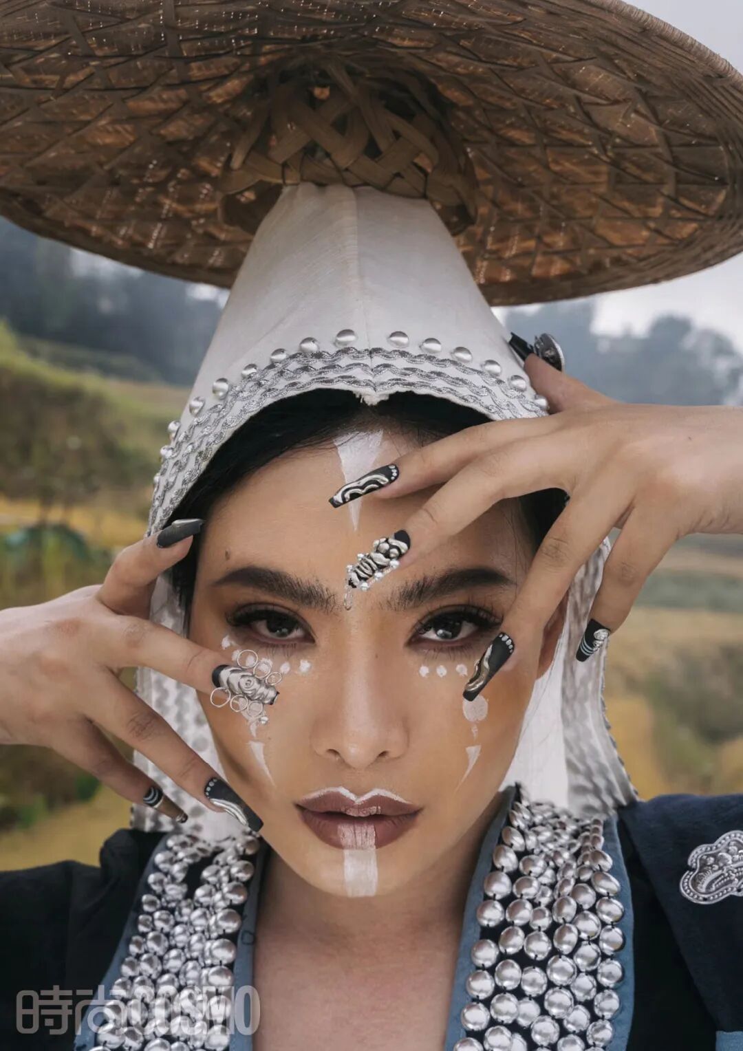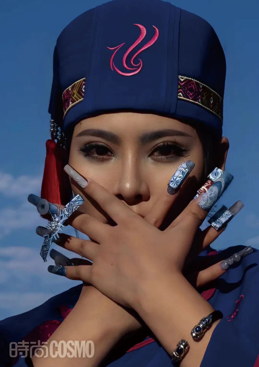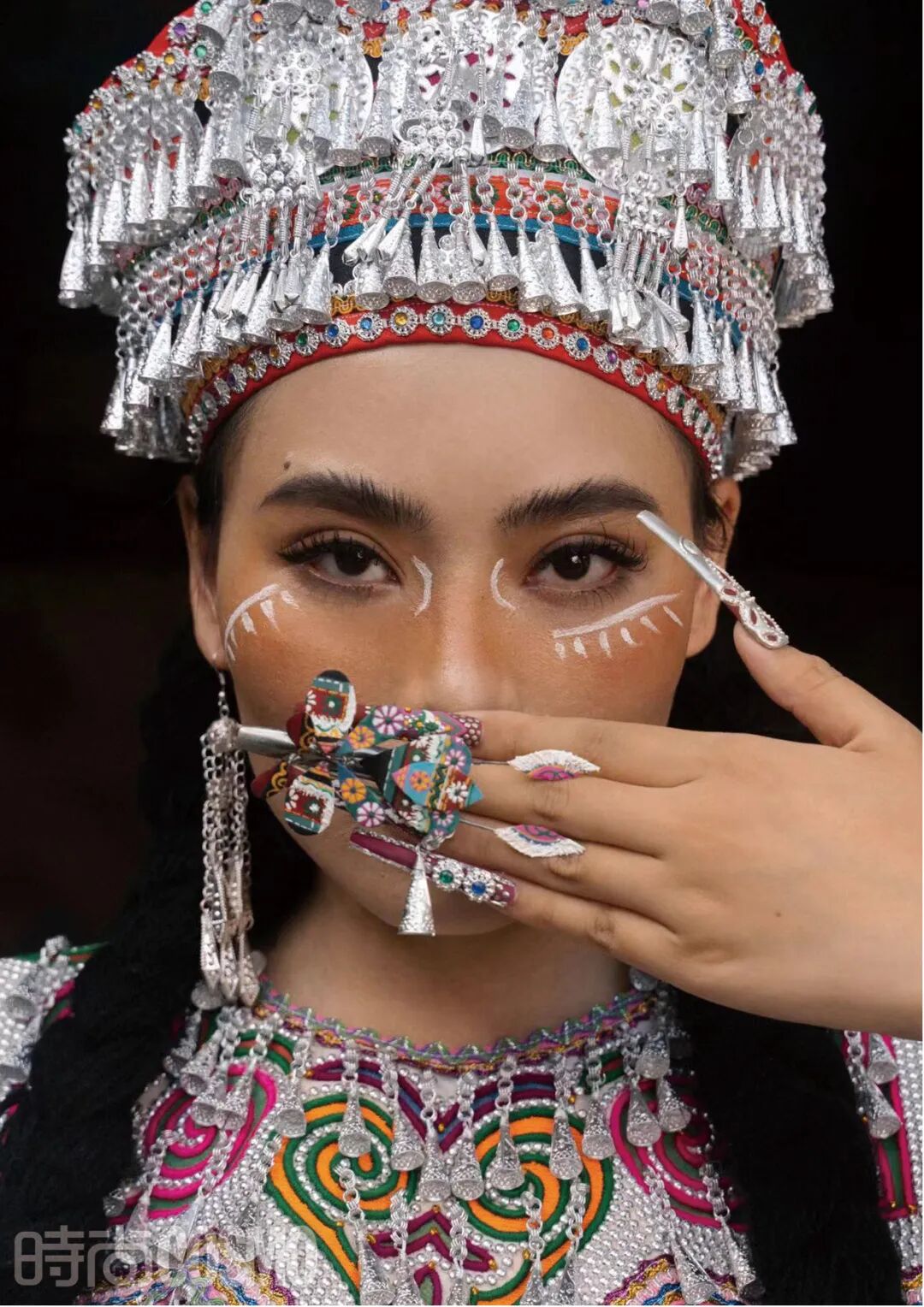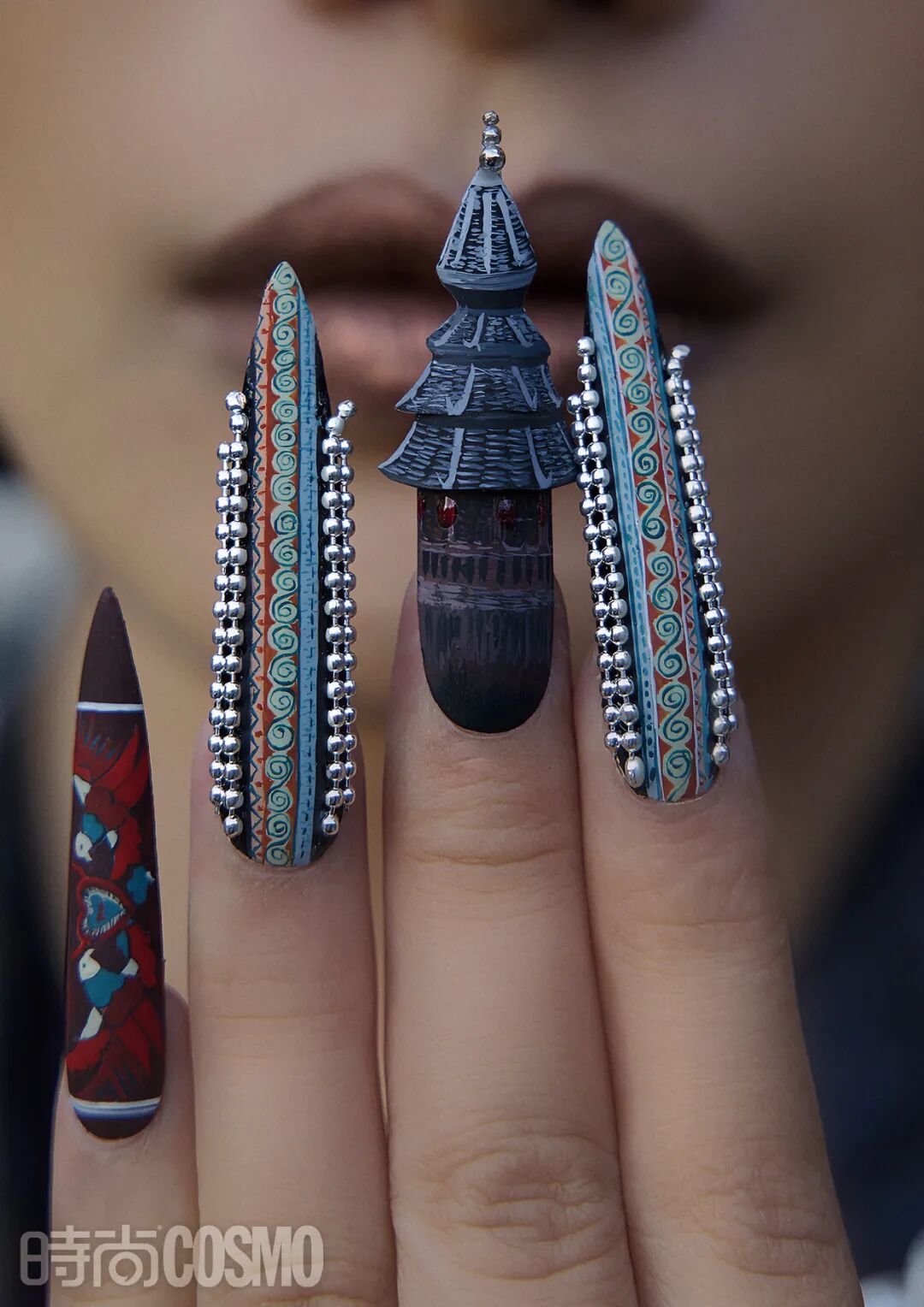 当然,创作本身的意义也在这一系列中被扩充不少,比如,对于少数民族文化的了解。在拍摄民族风系列的美甲创作视频前,王馨平和团队总是会做大量的背调,而后去提取当地标志性建筑的元素。以哈尼族为例,他们发现,当地最有特色的是“蘑菇房”,是哈尼族祖先留下的文化遗产,现在仍有大部分人住在那样的房子中,他们便将这一少数民族的美甲创作的基底色调定为褐色。又观察到当地人在日常所穿着的服装,彩色毛球、铜片及刺绣等,再将这些细节分别提取。再根据大家切实体会到的风土人情来做最终定调——一款民族风美甲创作就这样完成了。