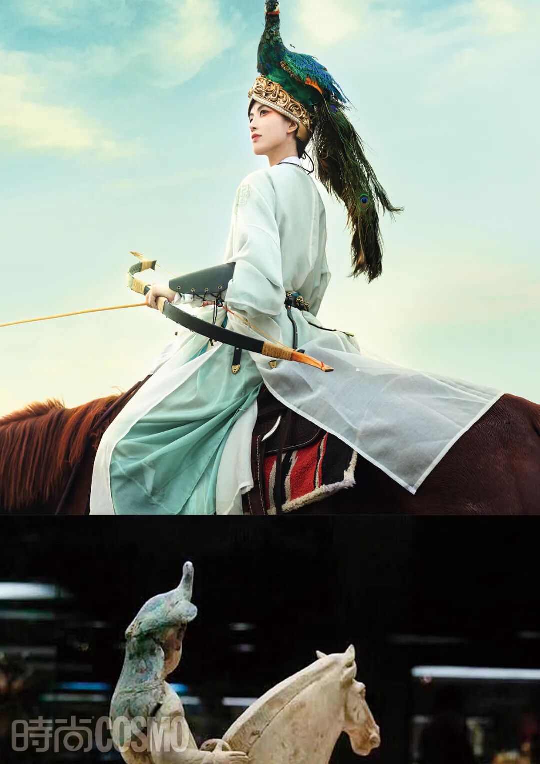 另一件惊艳的作品,是唐俑孔雀冠。她看到西安博物院这个出自唐朝的孔雀冠骑马击鼓女俑,被那种“想戴什么就戴什么”的肆意洒脱感染。她找朋友帮忙制作,在相关视频里,有个镜头是她蹲在草丛中,只露出头冠,旁边站着一只真孔雀,两者几乎一模一样。作品发布后,有人甚至问:你们是买了标本吗?菜菜在采访最开始就指出:汉服文化并非cosplay的一部分—COS是扮演,而现在的中国人穿汉服是在生活里穿一件喜欢好看的衣服,恰好这件衣服,展现了中华文化上下五千年的文明。