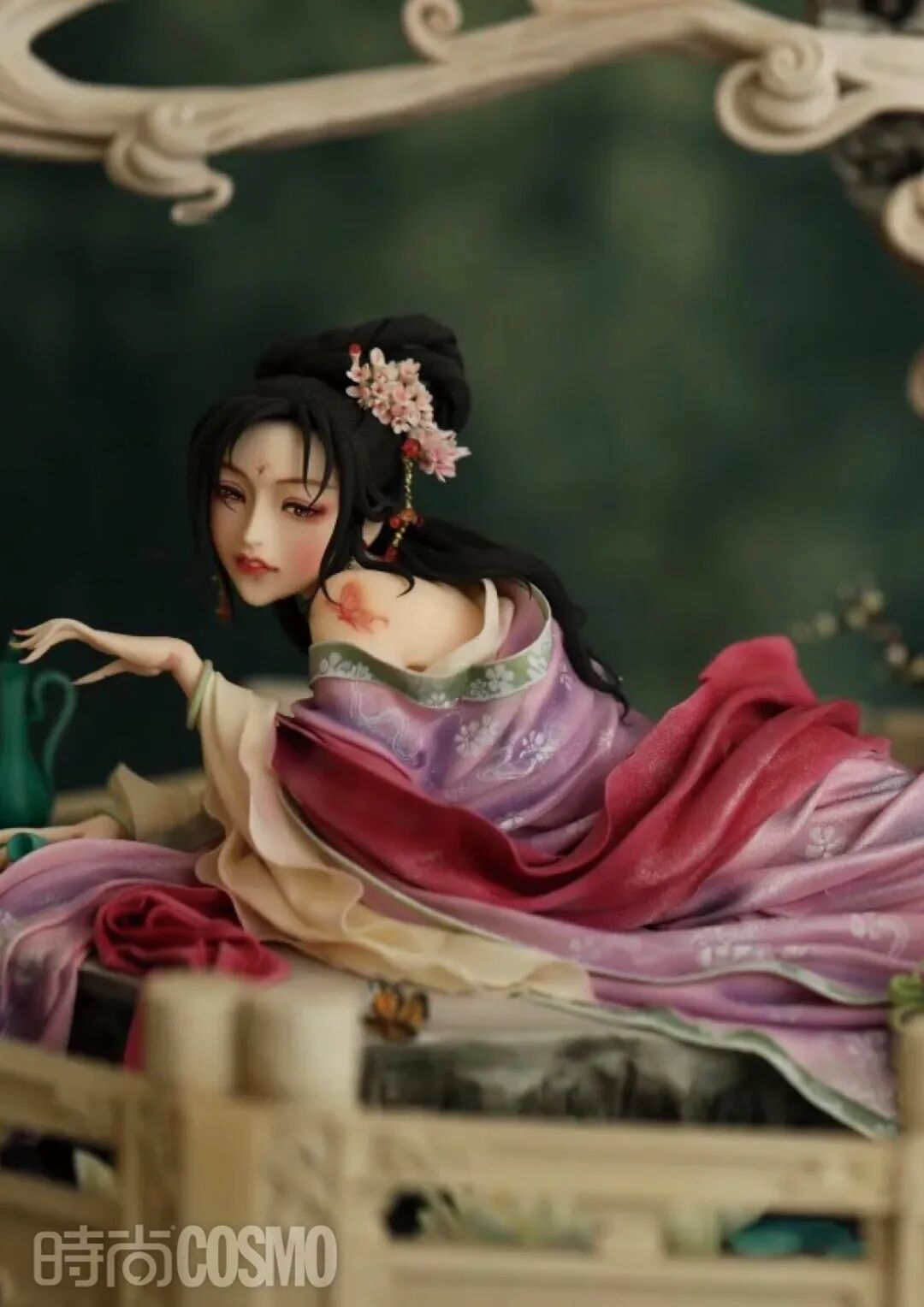 “国风不是只给人物套上一个古装的造型,而是讲好这一方天地里的史诗故事,只有文化赋形才能使一门技艺更长远地流传下去。”于是,周毅源源不断地创作了《青鸟》《唐婉》《九尾》《武则天》《虞美人》《醉卧忘忧境》等多个作品,这里面的大多数都是国风题材。他创作的国风人物以历史与神话中的女性为主,这些国风美人的神情灵动,从头到脚所镶坠的饰品也都华丽精美,连衣服上的纹理褶皱都清晰可辨。