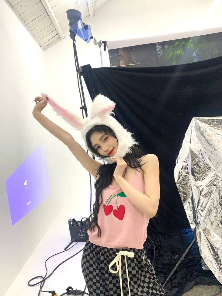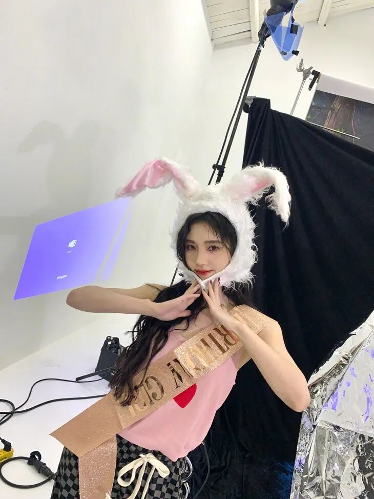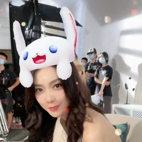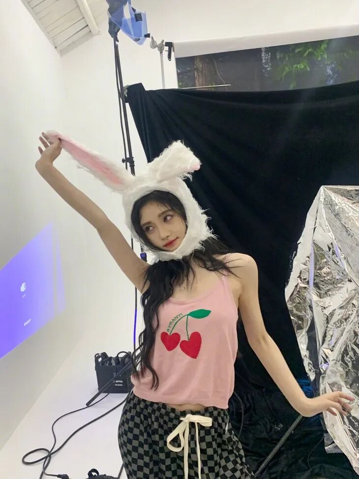 全身照姿势参考鞠婧祎,与兔子头套来些互动,拽着兔耳双手向上伸展,整个人的状态都要做到最放松,动作幅度可以适当夸大。