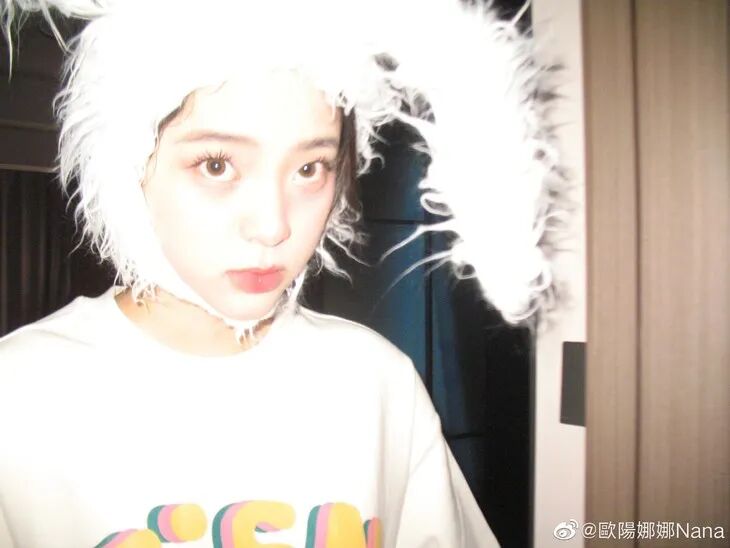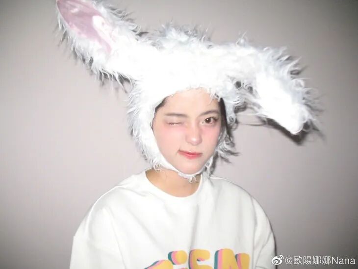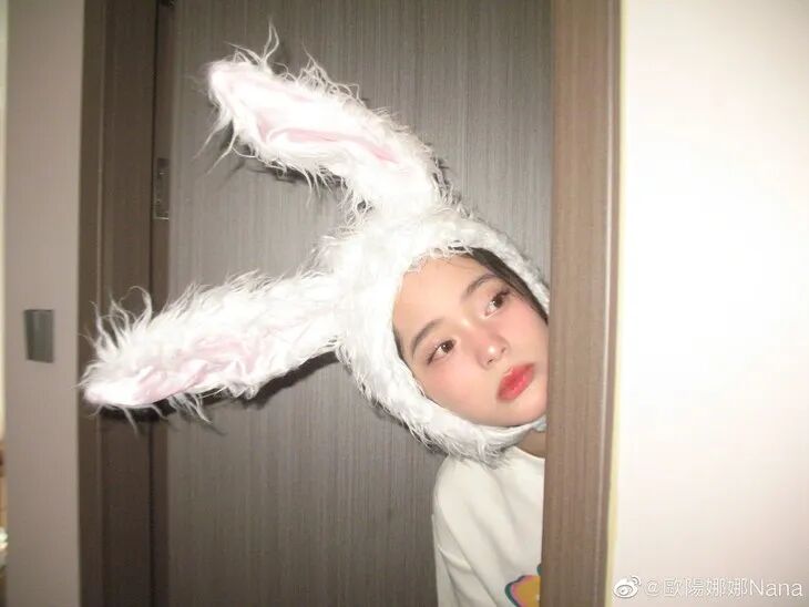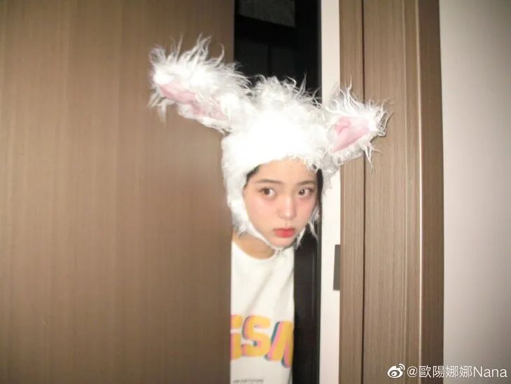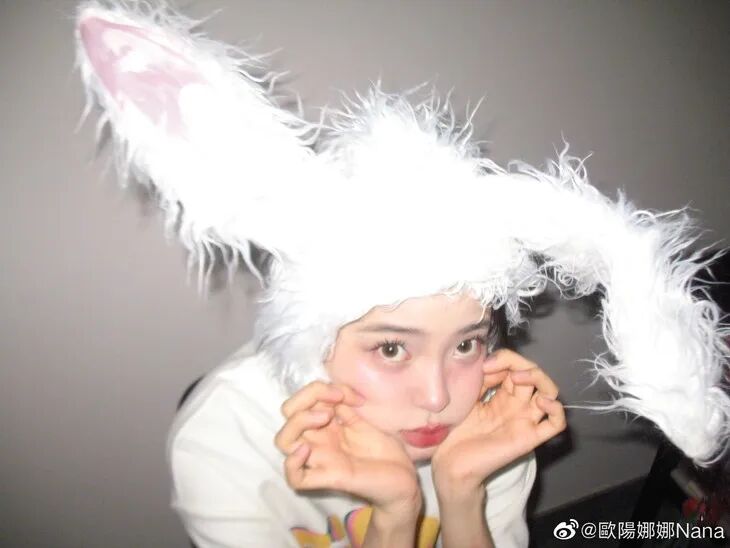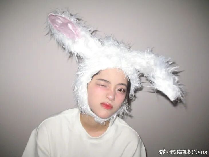 欧阳娜娜之前也拍摄过兔子头套的写真,简单的白t、清透的妆容,大面积的粉色扫在两颊处,微微柔焦的妆效,肉眼看着就嘭嘭的,显得特别幼态,这不就是纯欲小奶兔嘛。