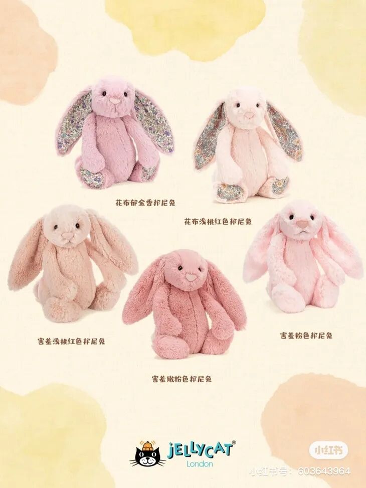 它叫邦尼兔,它的名称来源是一位小朋友在梦里同时梦到了jelly和cat,创始人觉得很可爱,于是这个品牌就诞生了。Jellycat一直用最环保健康的原料制作玩偶,用料严格把控,就算宝宝不注意放嘴里啃咬也没事。