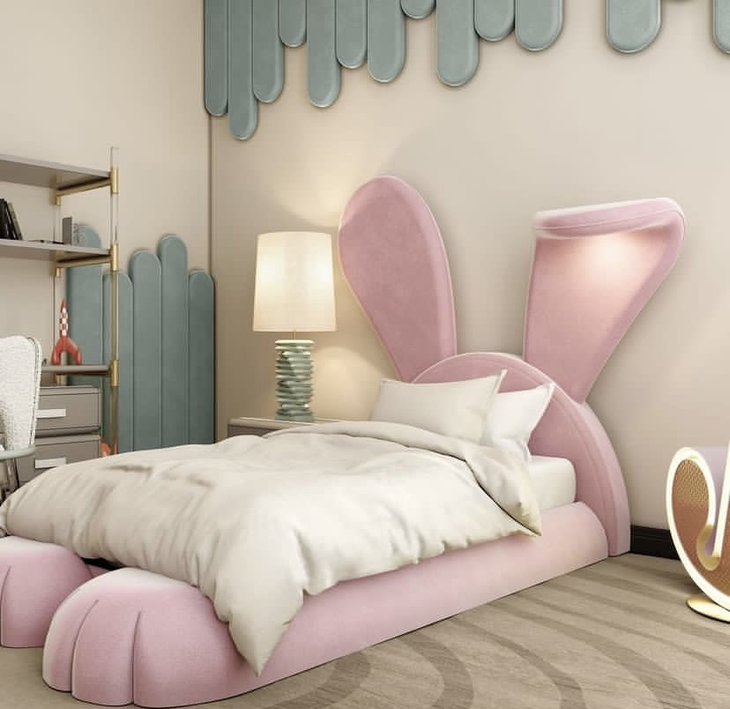Mr.Bunny这款兔子床,整个床身的设计都来源于小兔,床头是竖立起来的兔耳朵,其中一只还是折耳形态,平增了一种动态的俏皮感。圆润厚实的双脚紧抓地面,整个身姿都是匍匐的模样,躺在小兔温暖的怀抱中,是不是会更容易走进童话世界?