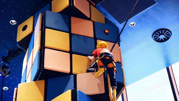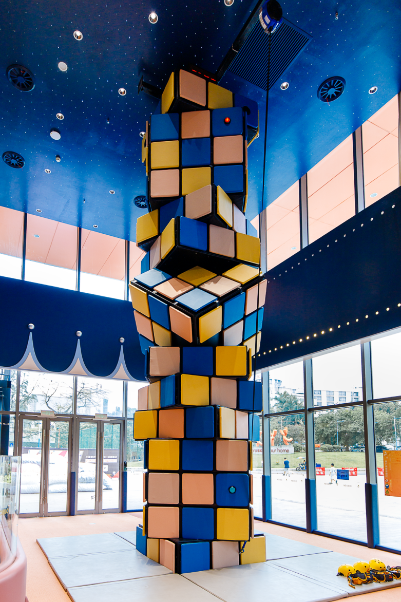 其实这里是魔方攀岩。多个巨型魔方堆叠在一起,犹如《神奇的魔豆》里面的巨型藤蔓,向上延伸,吸引着小勇士们前来挑战。