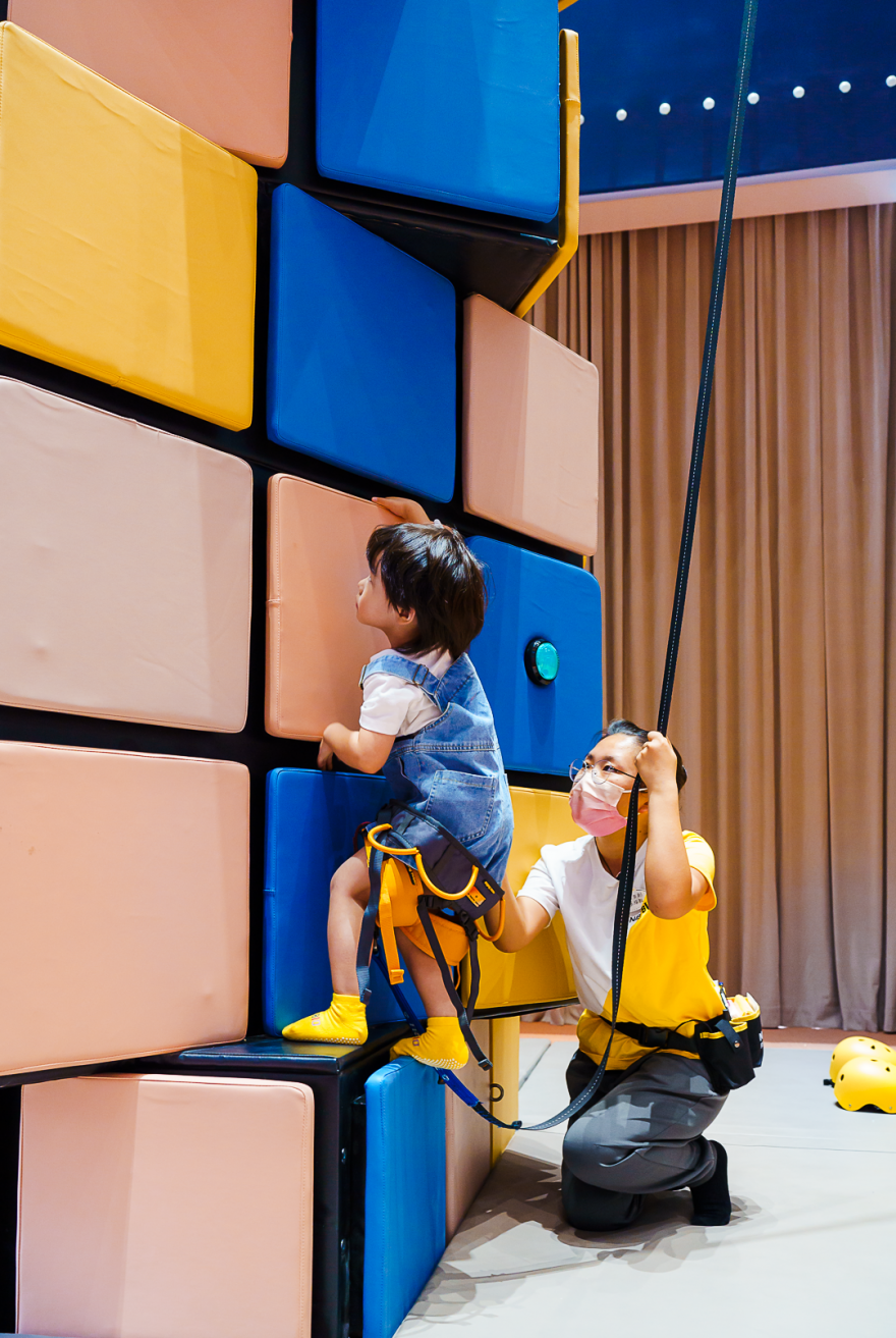更让人窝心的是,现场不仅为小朋友准备安全装备,还有专业教练指导,让小朋友尽情体验攀岩乐趣。
