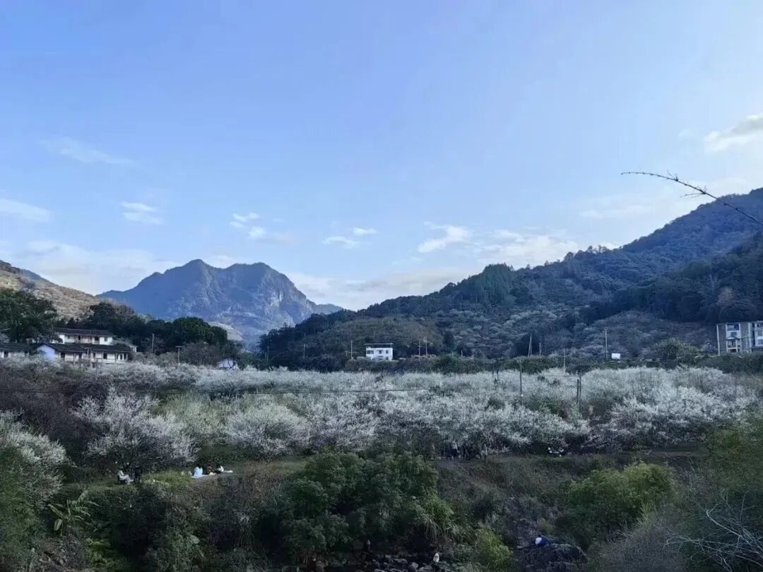 春节假期,永泰葛岭镇溪洋村文埕湾山岭起伏间,梅花盛开如雪、暗香浮动,吸引不少游客前来打卡。