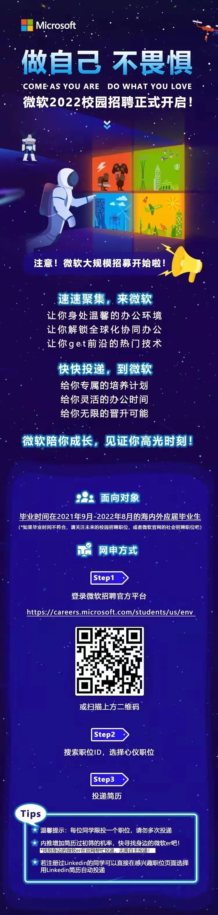 微软不只创造办公软件,更热爱为所有微软的员工创造优质的办公环境 说这么多了,还不心动吗?秋季热招正在进行,来微软一探究竟吧。