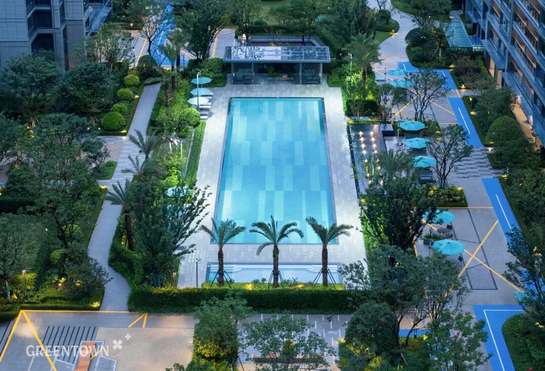 主入口迎宾镜面水景,营造出轻盈灵动之美。挑高式入户大堂,兼顾仪式感和艺术调性。穿过大堂,步入园中,建筑恰好与园林景观形成融合之美,建筑似是“从花园中生长起来”。超大中央景观草坪,为未来多重生活场景提供可能。景观水池色彩明艳,两侧的棕榈树打造度假风情。