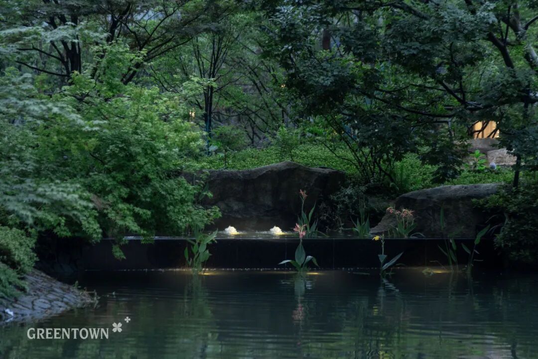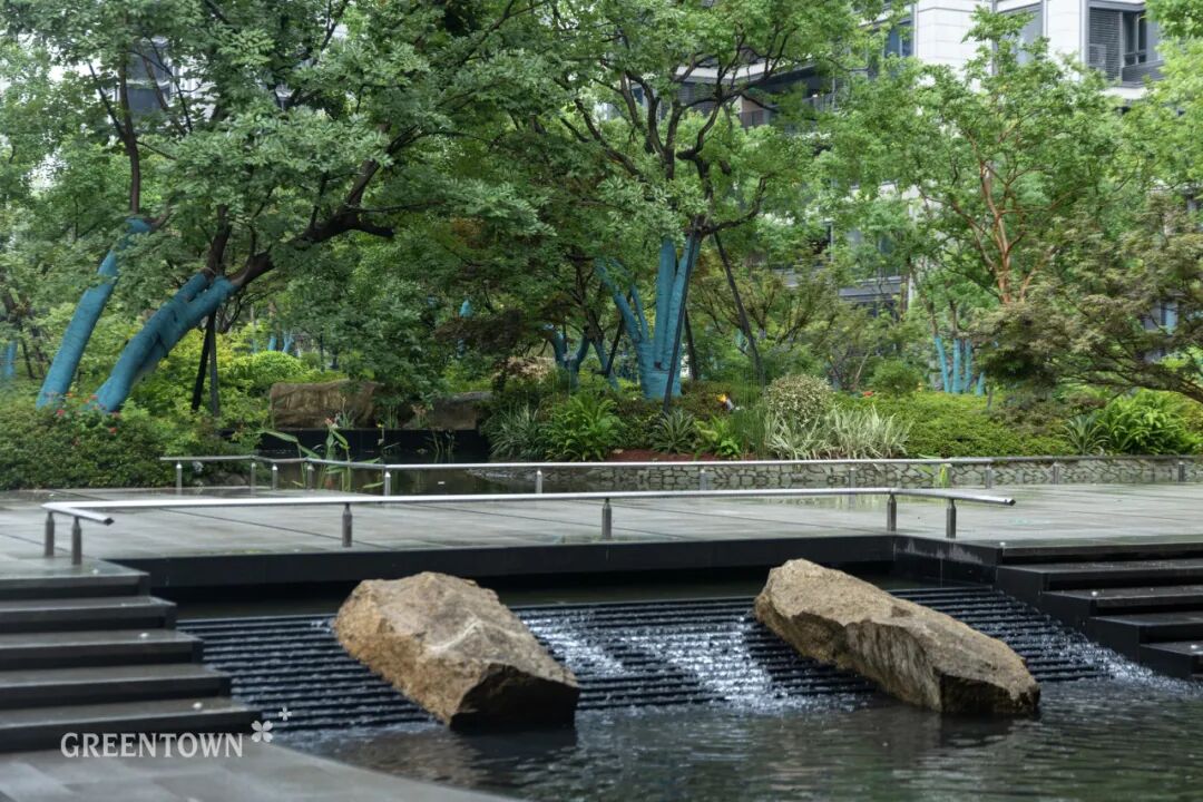 桂语江南舍弃繁复堆砌式的造景手法,更注重景观与生活的共鸣。通过更具品质感的造景艺术,呈现一方与心灵、与自我对话的园境。林、水、园、青石组合在一起,像窥见了丛林秘境——神秘、幽静、绿意层层叠叠。整体造景讲究“曲折有法”,营造出“迷路其间”的意境。